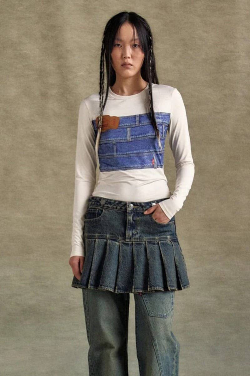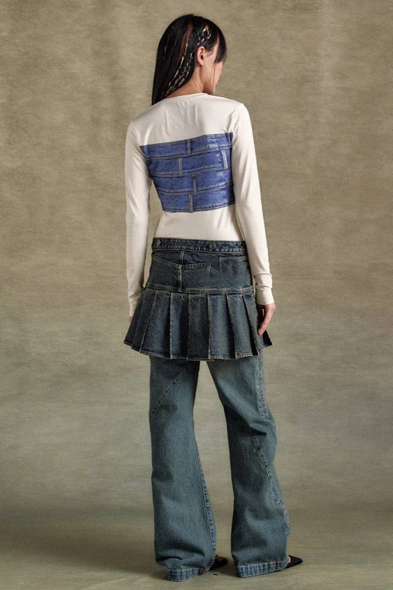 DENIM PRINT LONG SLEEVE CREWNECK T-SHIRT