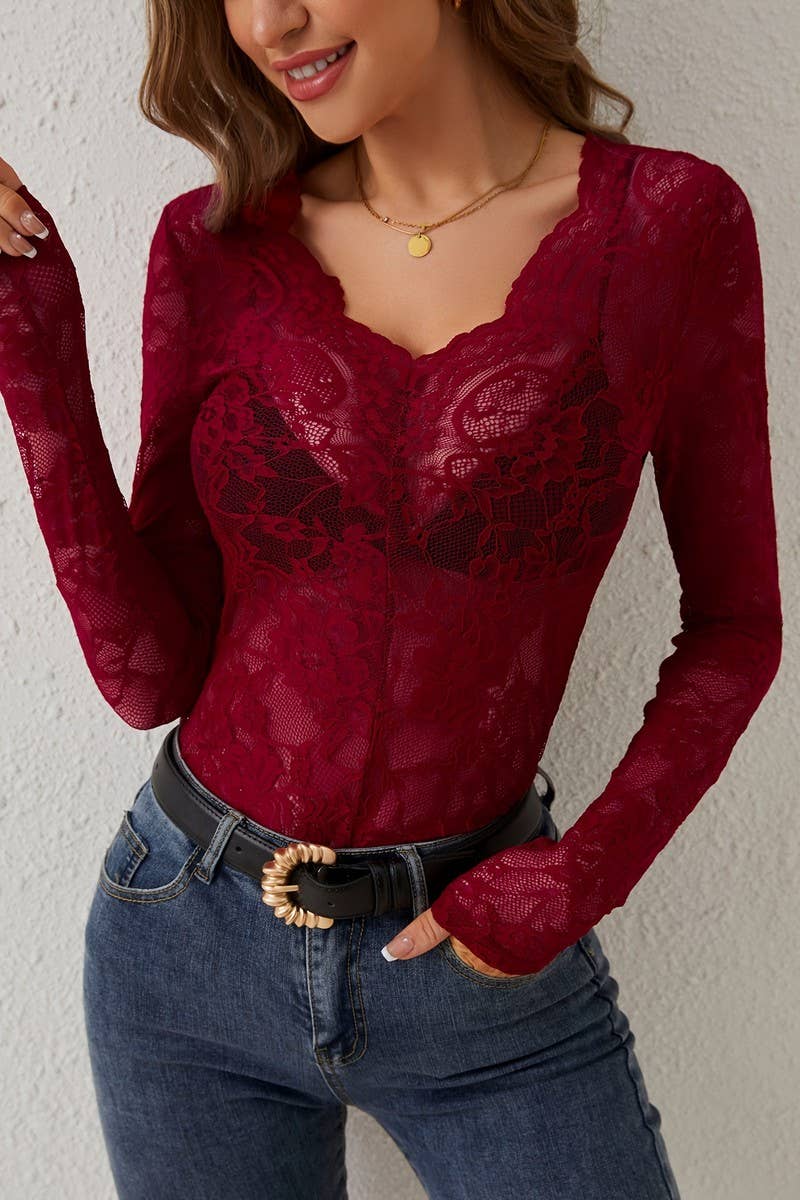 V-NECK SINGLE LAYER FLORAL LACE BOTTOMING TOP