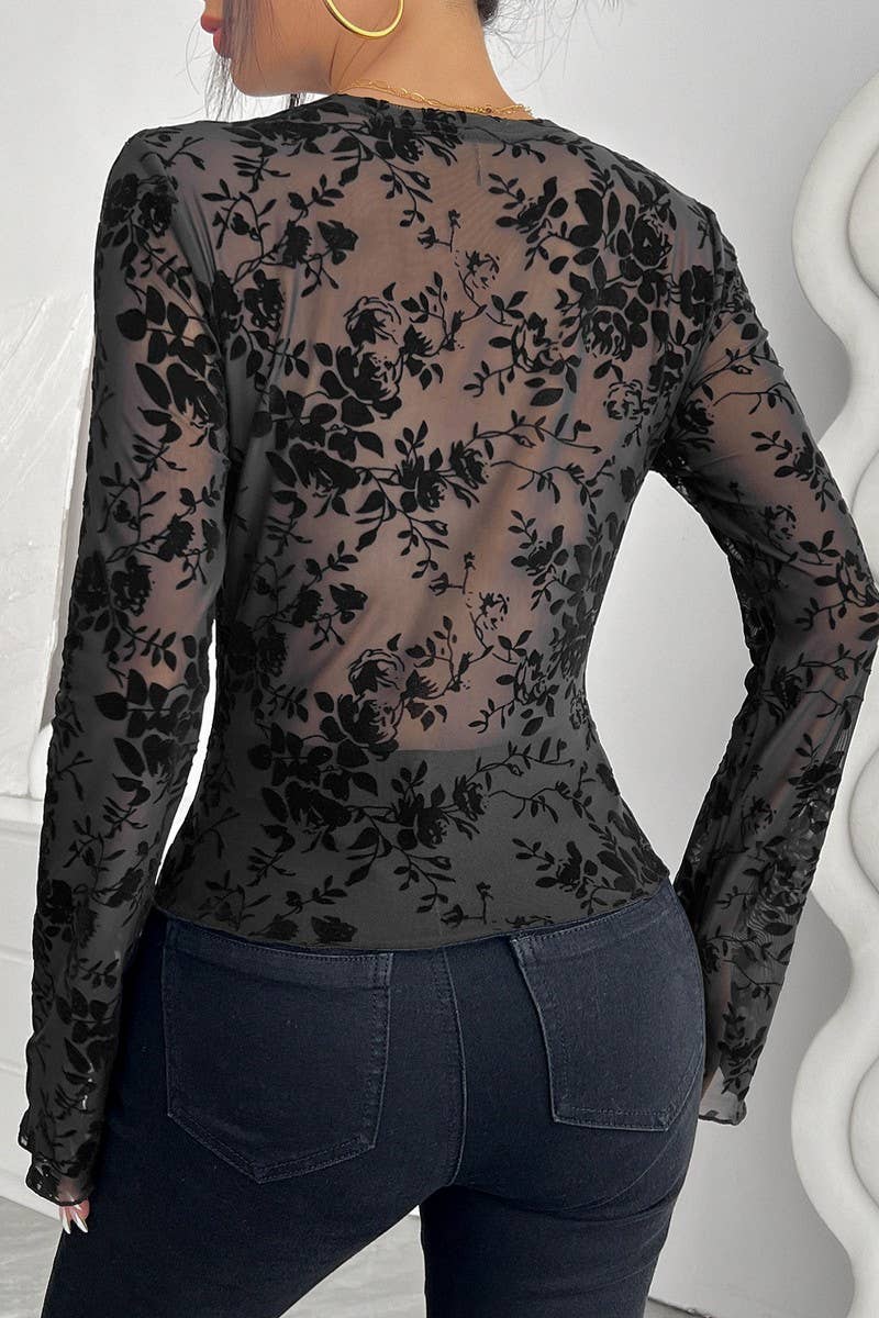 V-NECK LACE AND MESH TRUMPET SLEEVE TOP