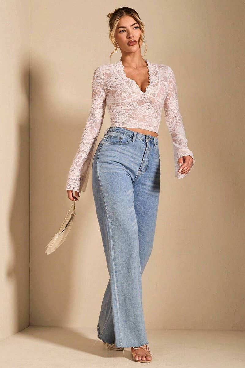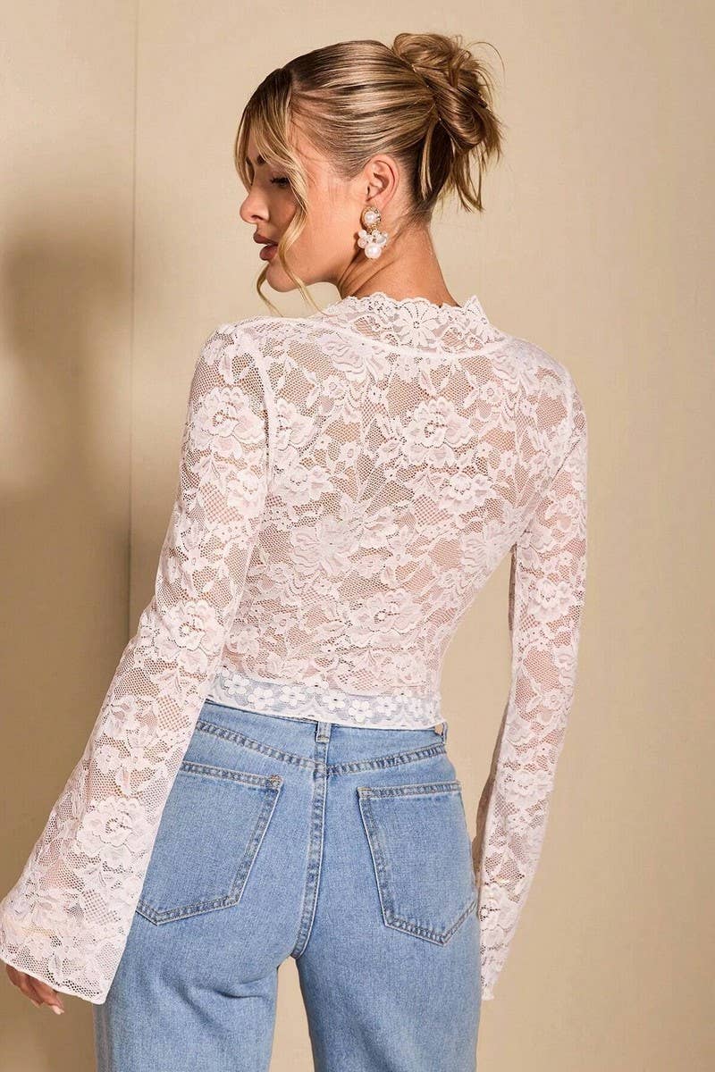 TRANSPARENT LACE V-NECK FLARED LONG SLEEVE TOP