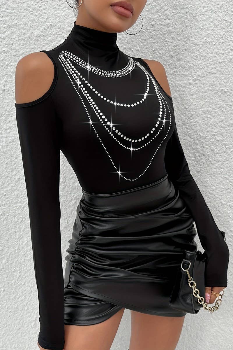 HEAVY-DUTY RHINESTONE HIGH-NECK OFF-SHOULDER TOP