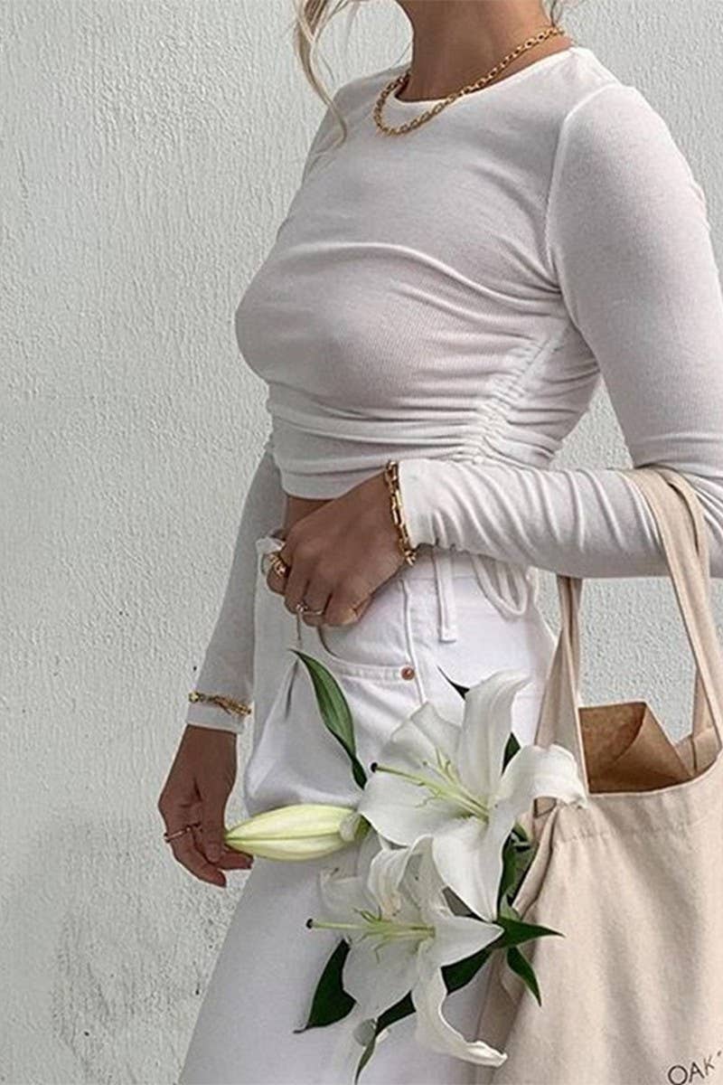 RIBBED DRAWSTRING LONG SLEEVE T-SHIRT CROPPED TOP