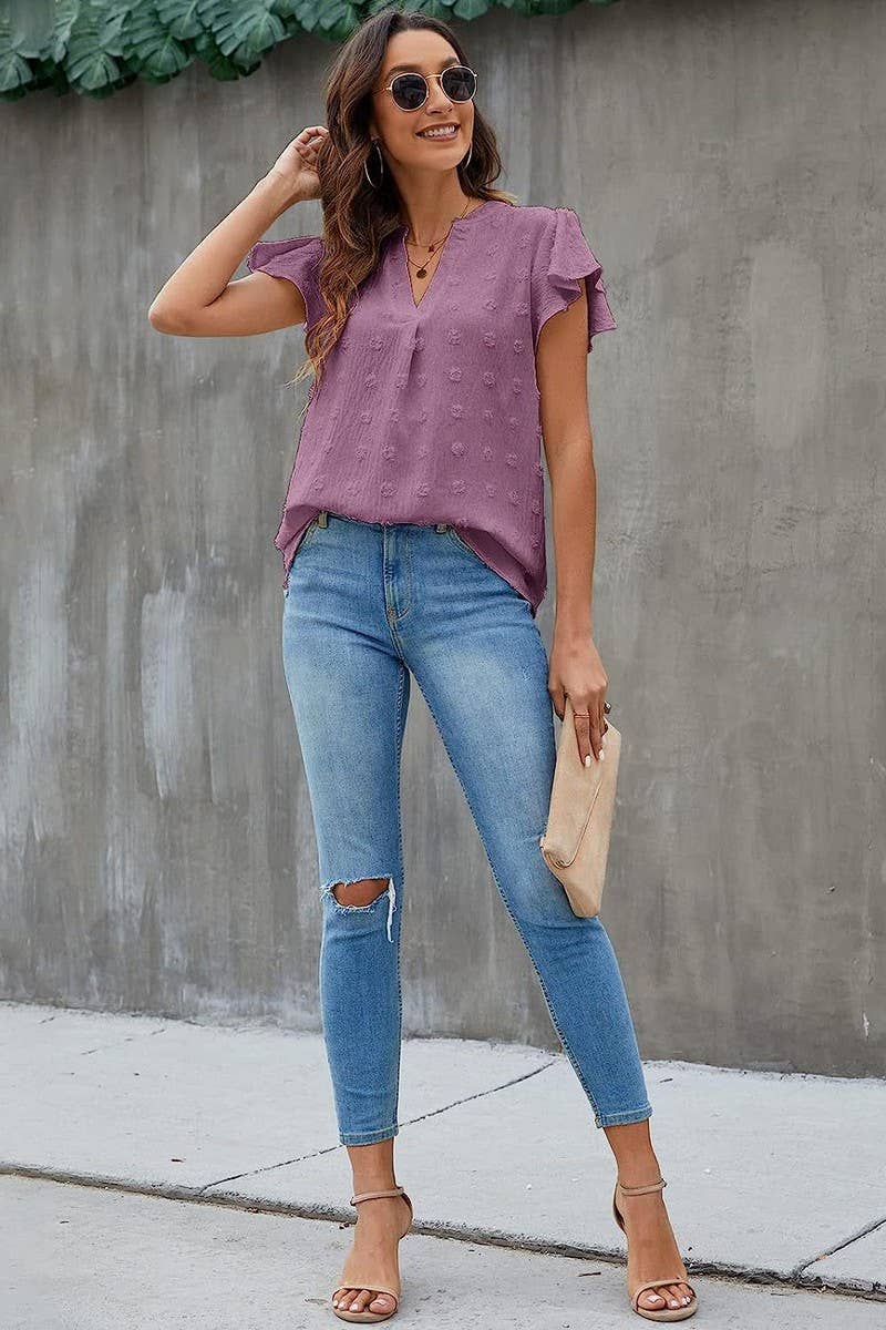 V-NECK RUFFLED SLEEVE CHIFFON SHORT-SLEEVED TOP