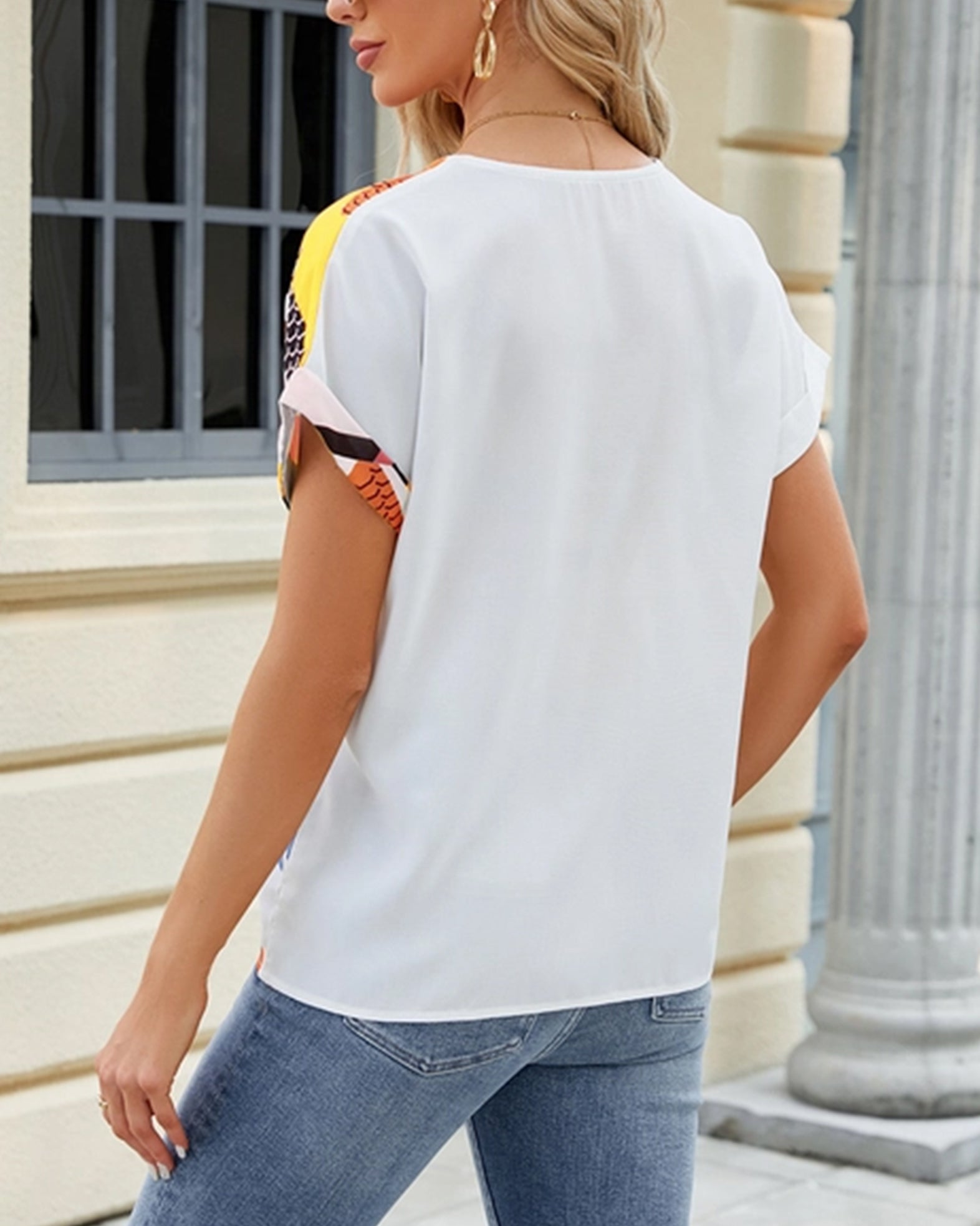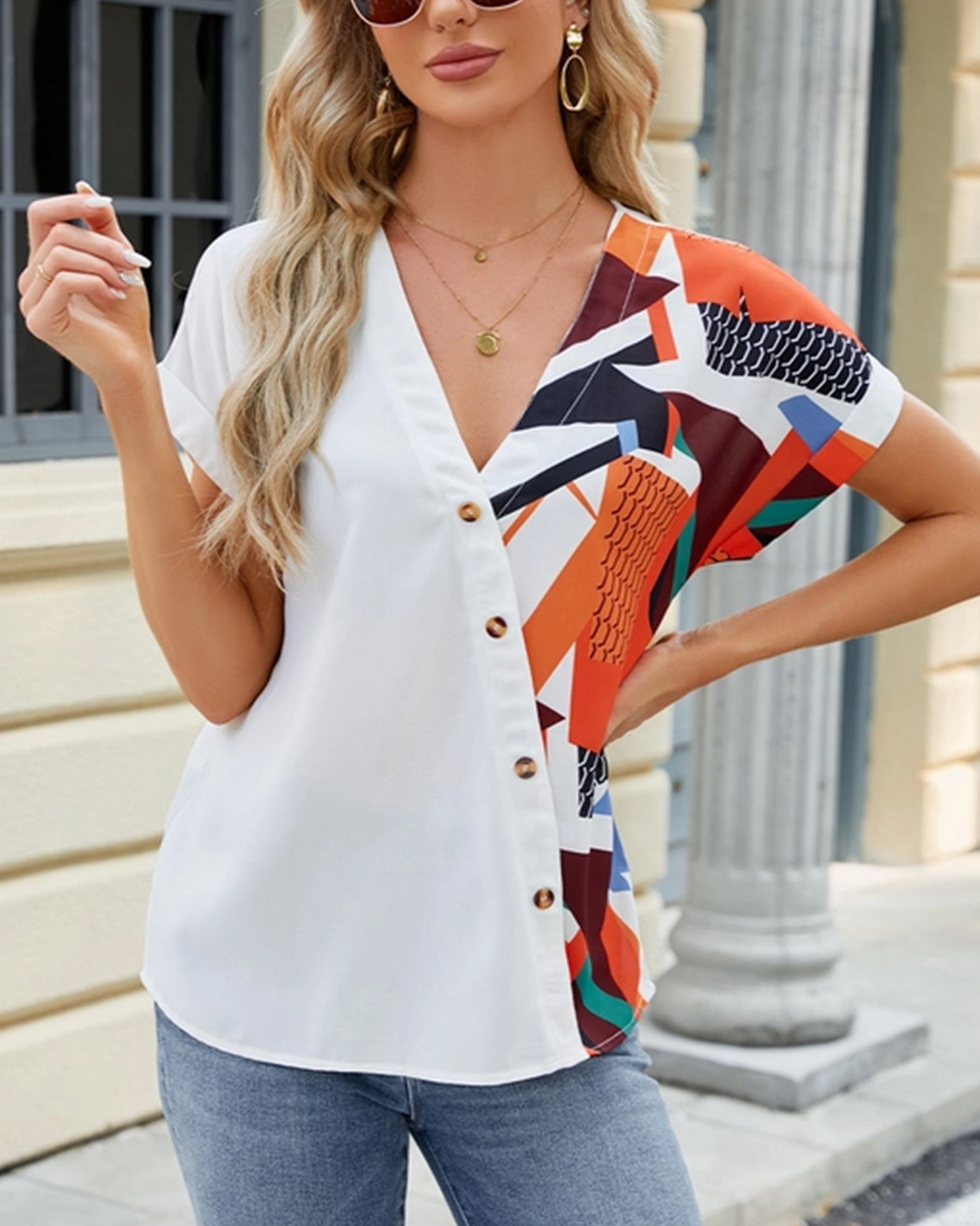 V-Neck Geometric Print Shoulder Loose Chiffon Top ??Lightweight & Breezy
