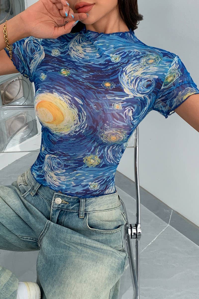 STYLISH BLUE PRINTED MOCK NECK MESH TOP