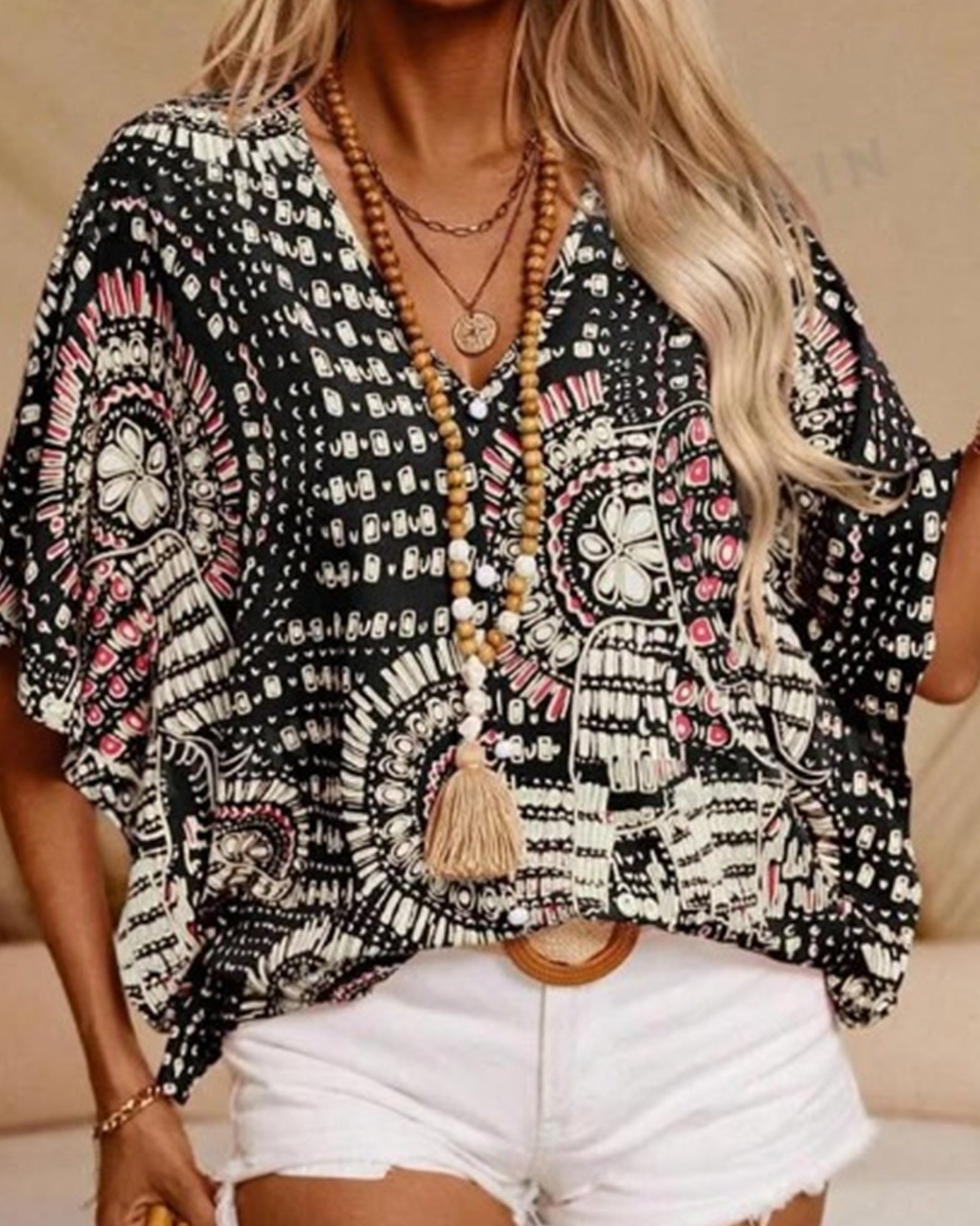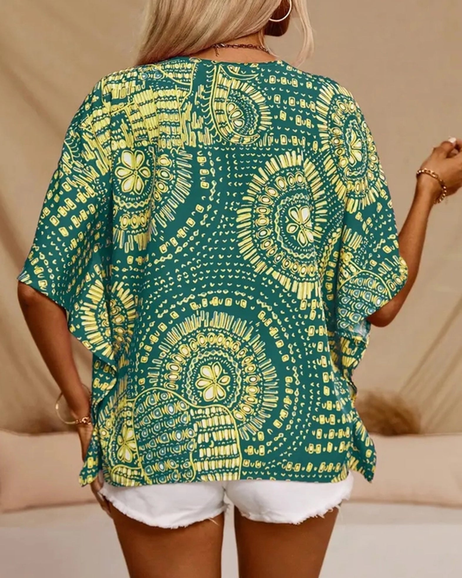 Experience effortless elegance with our V-Neck Printed Resort-Style Bat-Sleeved Top, designed to bring a breezy, relaxed vibe to your warm-weather wardrobe. Crafted from a comfortable blend of polyester and spandex, this top features flowing bat sleeves and a flattering V-neckline, perfect for vacation days or casual outings. Its vibrant print and lightweight fabric ensure you stay stylish and cool all day long.