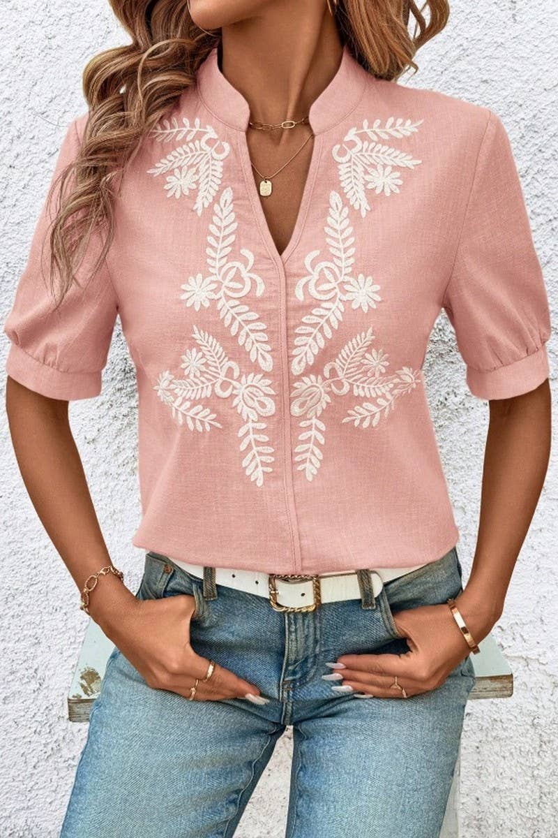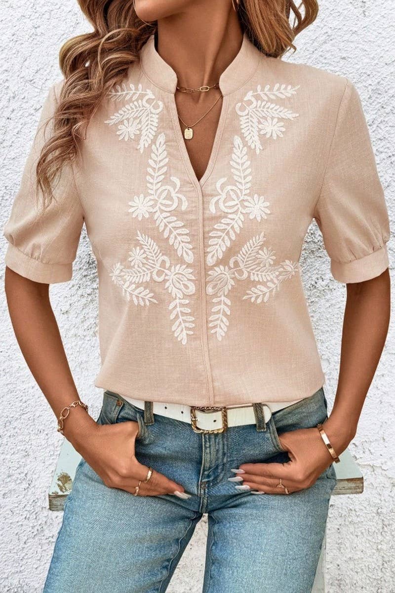 V-NECK COTTON EMBROIDERED SHORT SLEEVE SHIRT