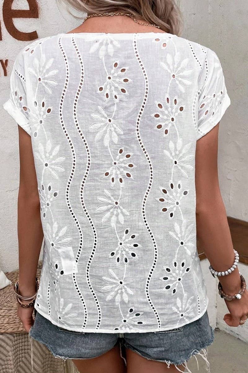 LACE EMBROIDERED EYELET SHORT SLEEVE BLOUSE