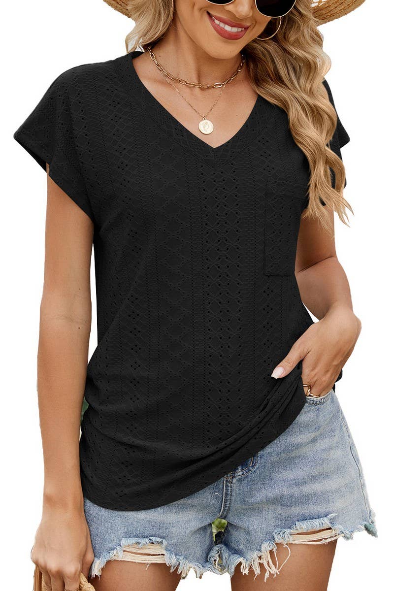V-NECK RUCHED SIDE POCKET SHORT SLEEVE TEE