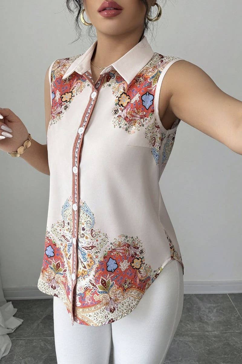 VINTAGE PRINT SLEEVELESS LAPEL BLOUSE