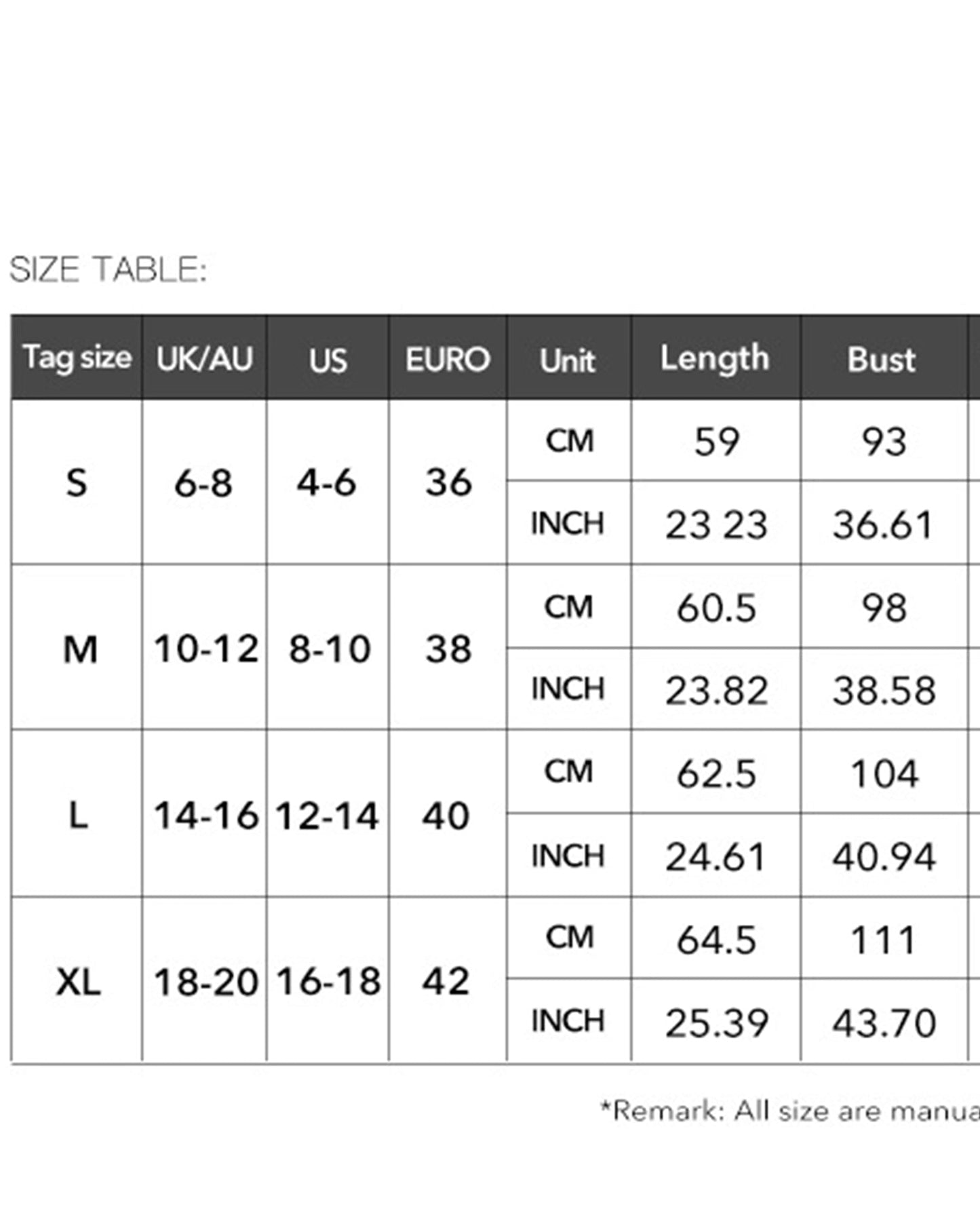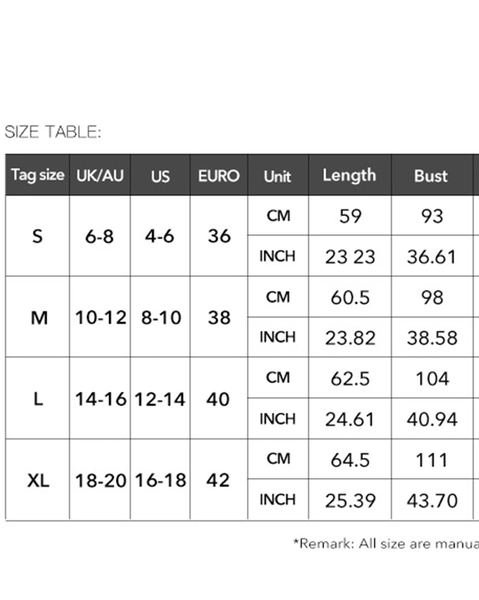 Size Chart (inch):