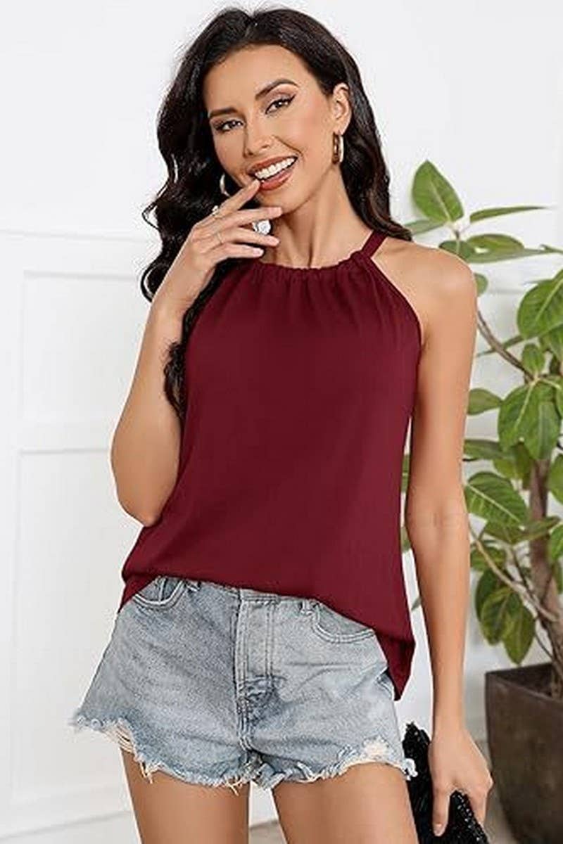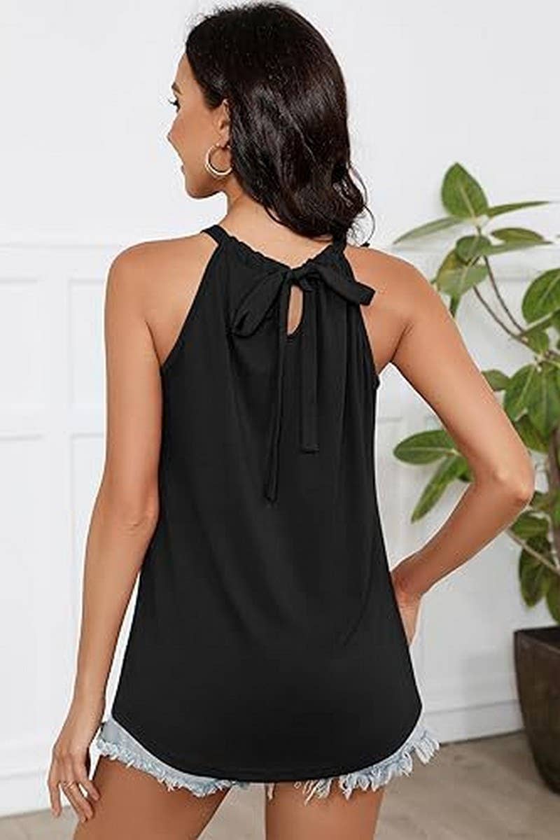 CASUAL SOLID RUCHED TIE NECK SLEEVELESS TOP