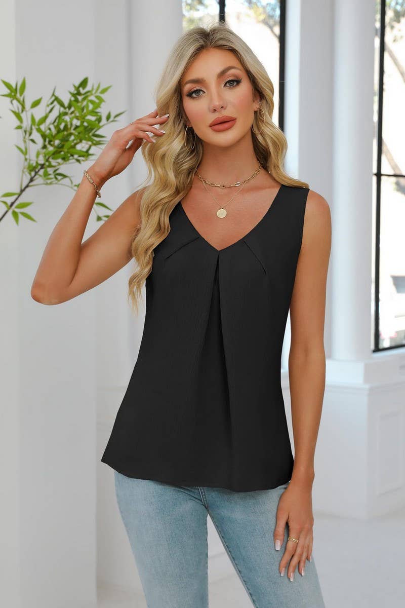 SOLID PLEATED V-NECK CHIFFON TANK TOP
