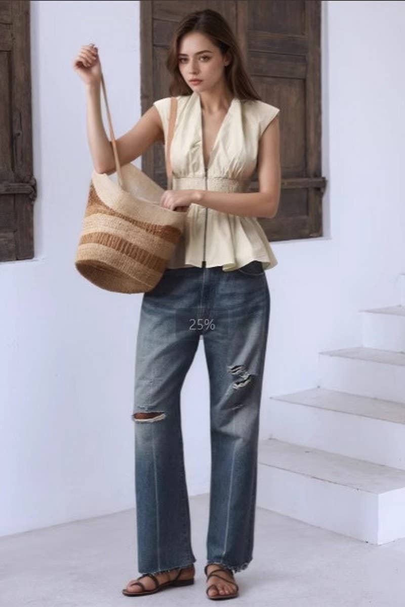SLEEVELESS DEEP V ZIP RUCHED WAIST FITTED TOP