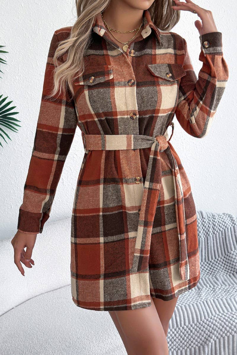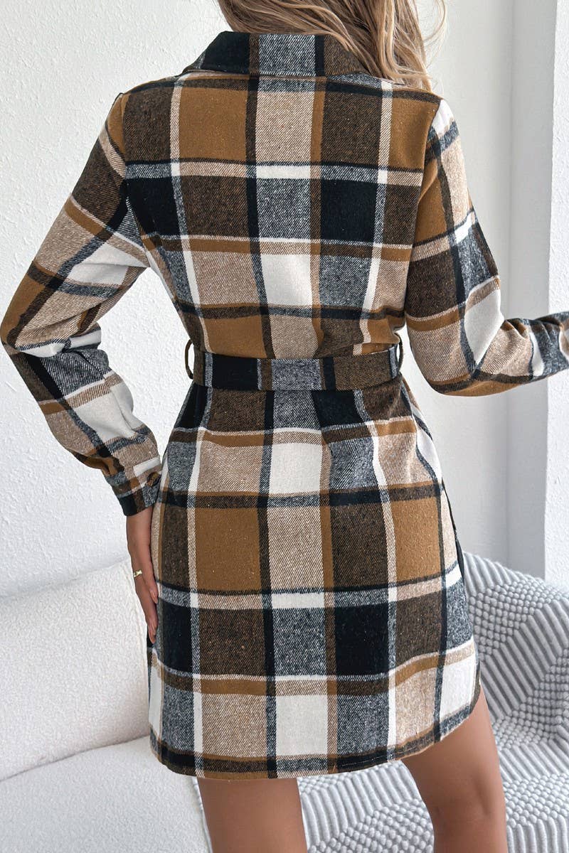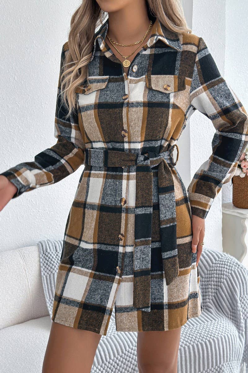 CASUAL COLORBLOCK LONG SLEEVE PLAID SHIRT DRESS