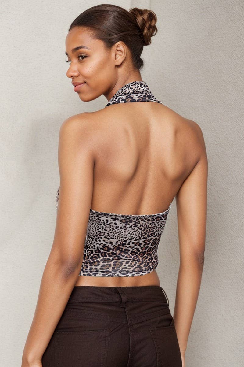 LEOPARD PRINT HALTER COWL NECK BACKLESS TOP
