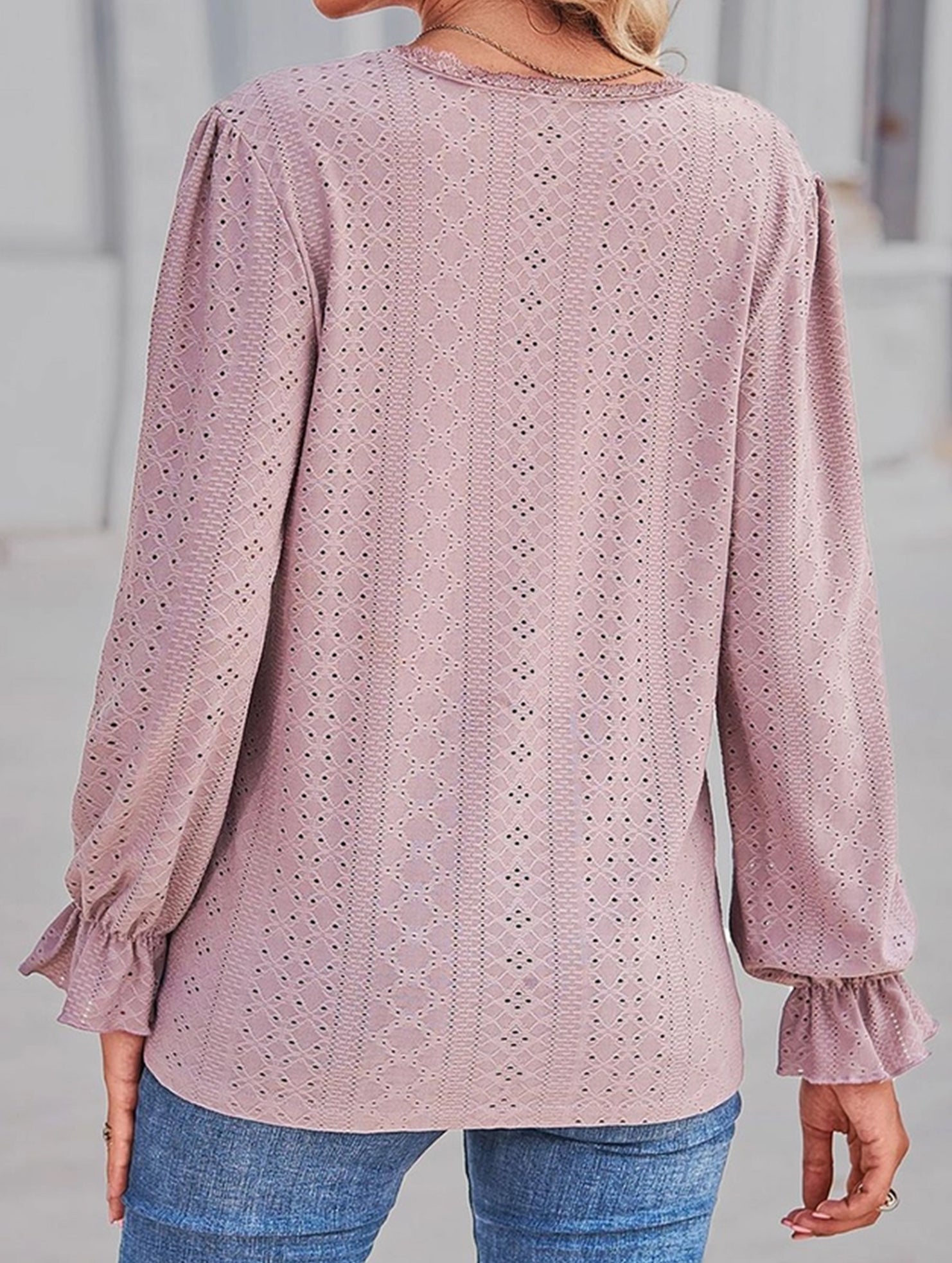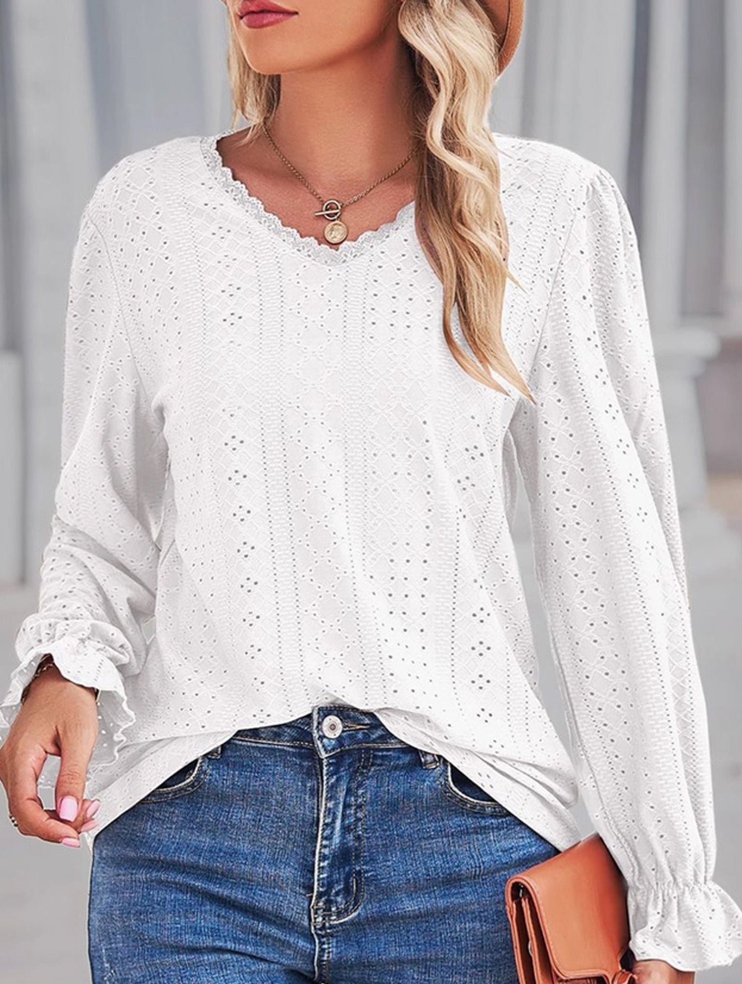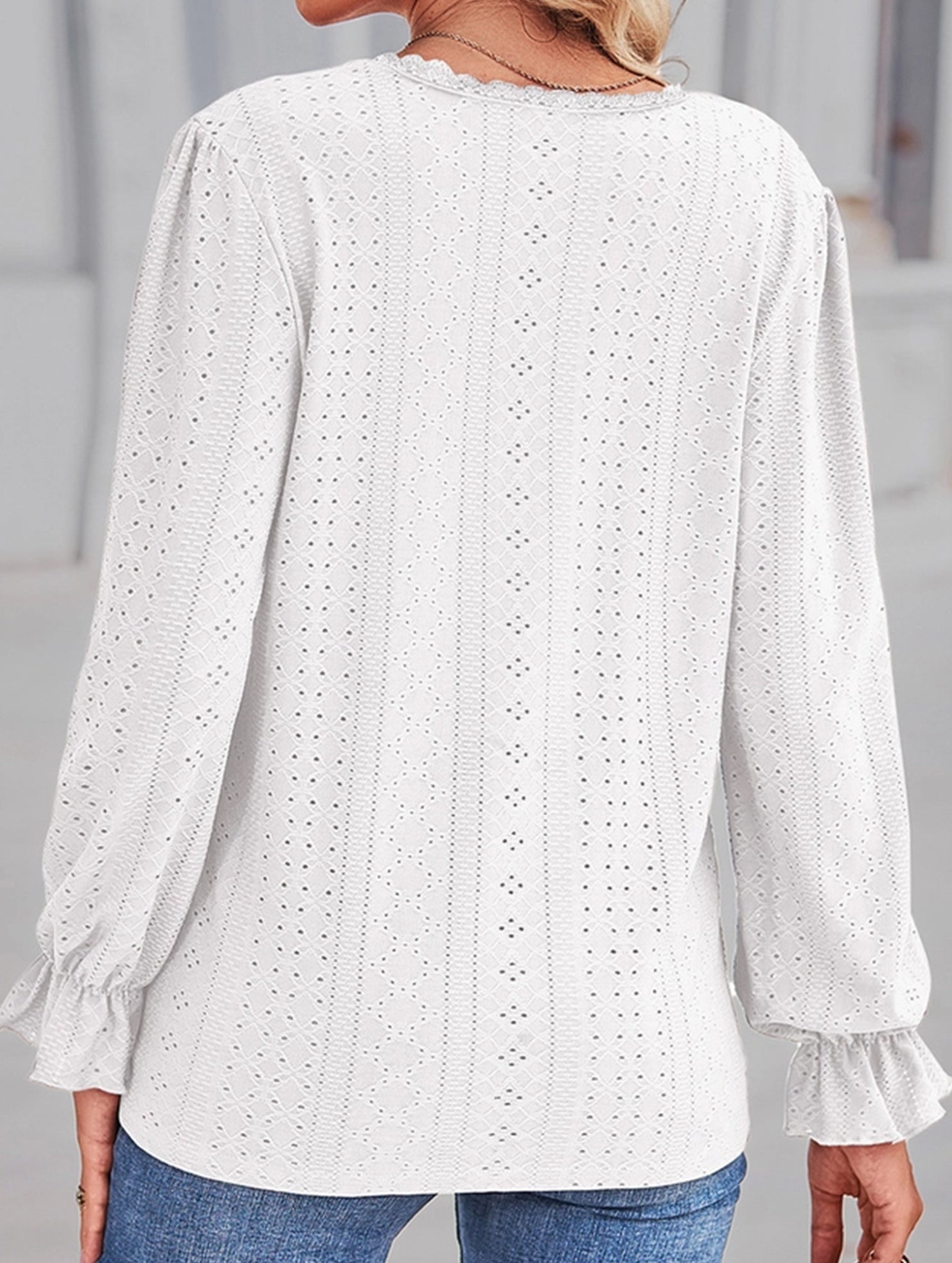 WOMEN LACE TRIM NECK EYELET LONG SLEEVE SHIRT TOP
