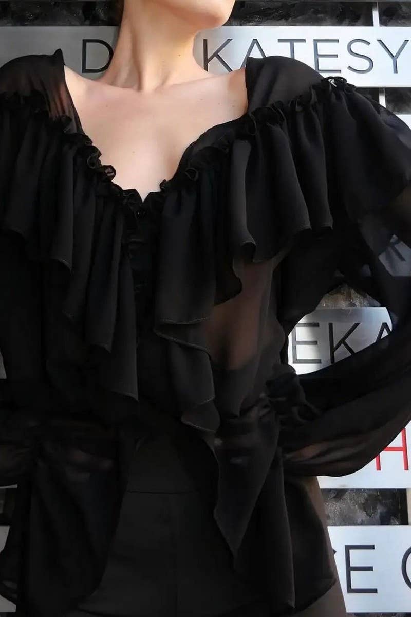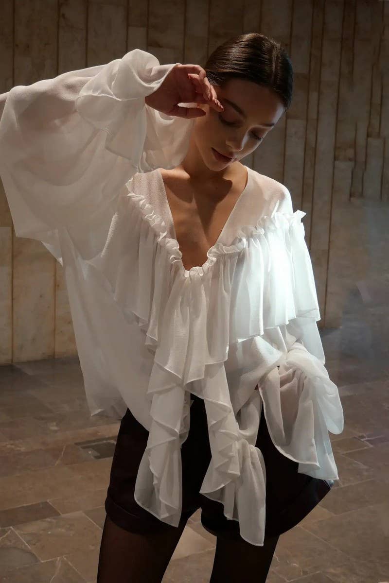 FRENCH RUFFLED LOOSE V-NECK SOLID COLOR NICHE TOP