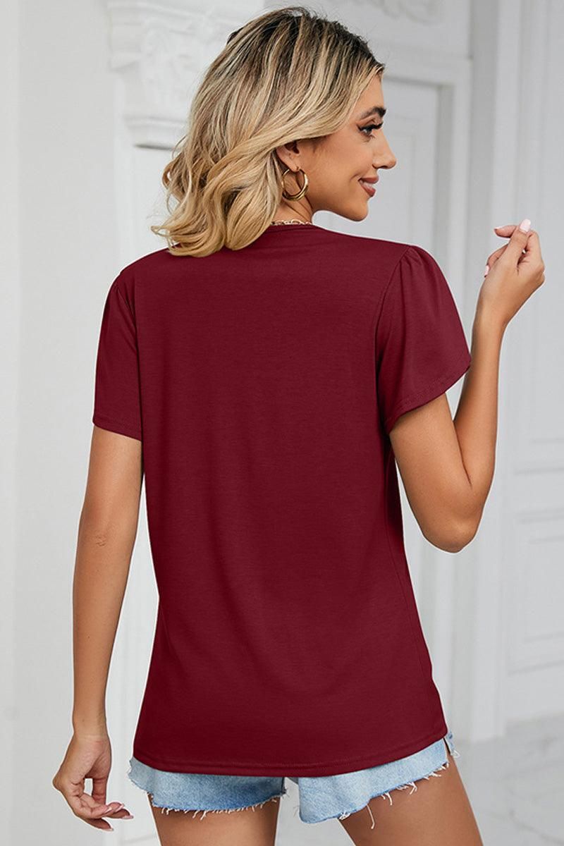 GOLD LACE V NECK RUFFLE SHORT SLEEVE TOP