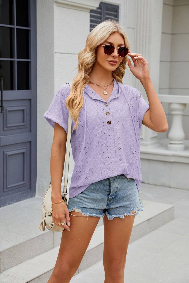 SOLID COLOR BUTTONED HOODED DRAWSTRING T-SHIRT