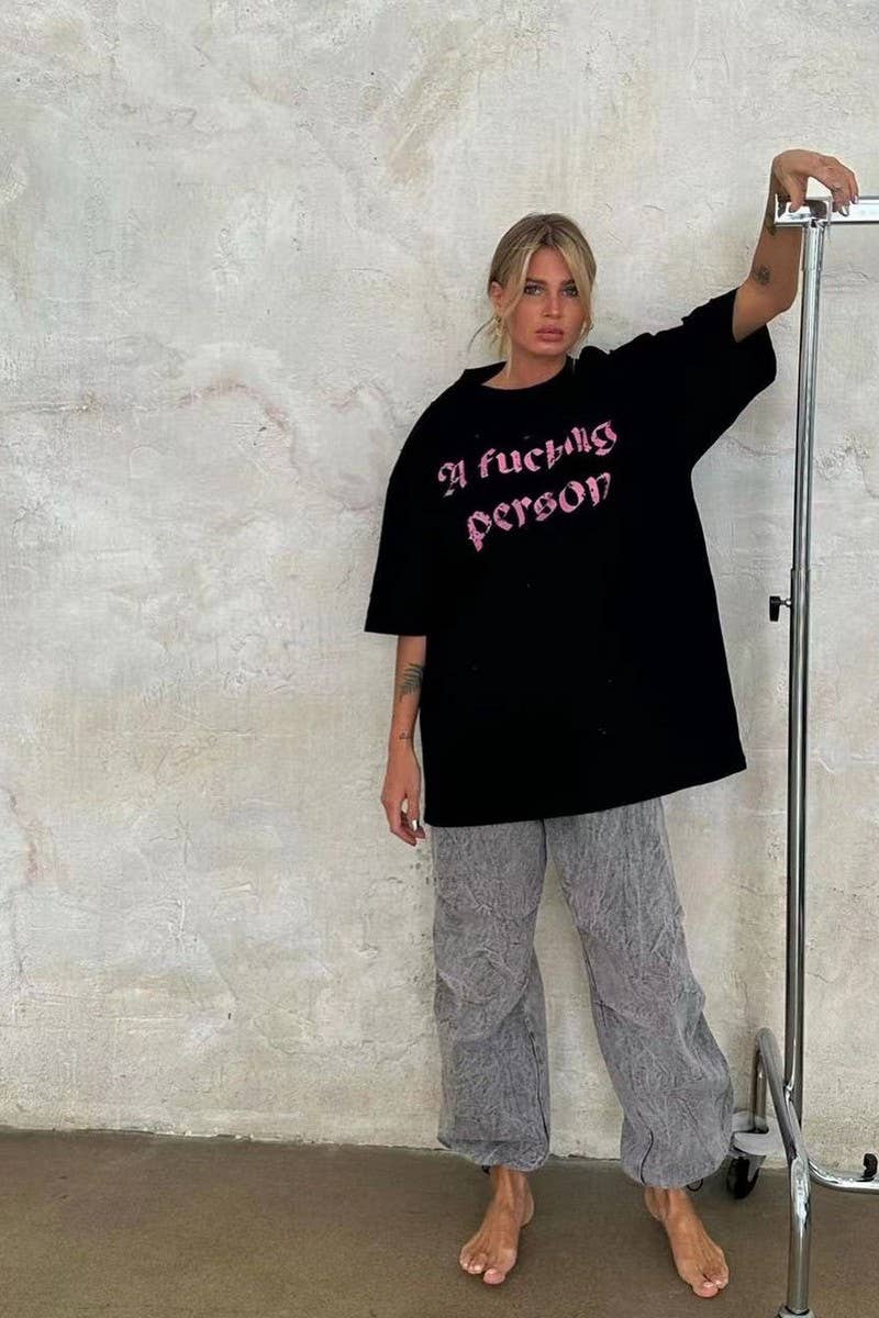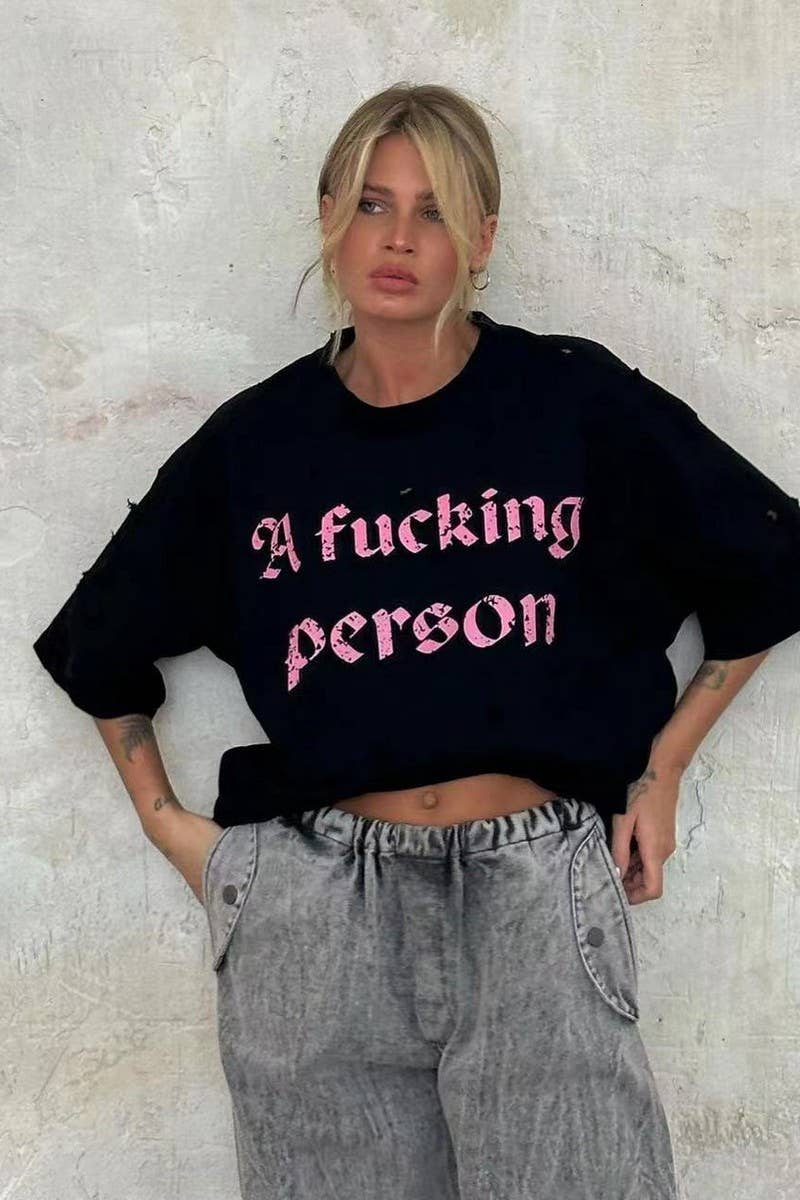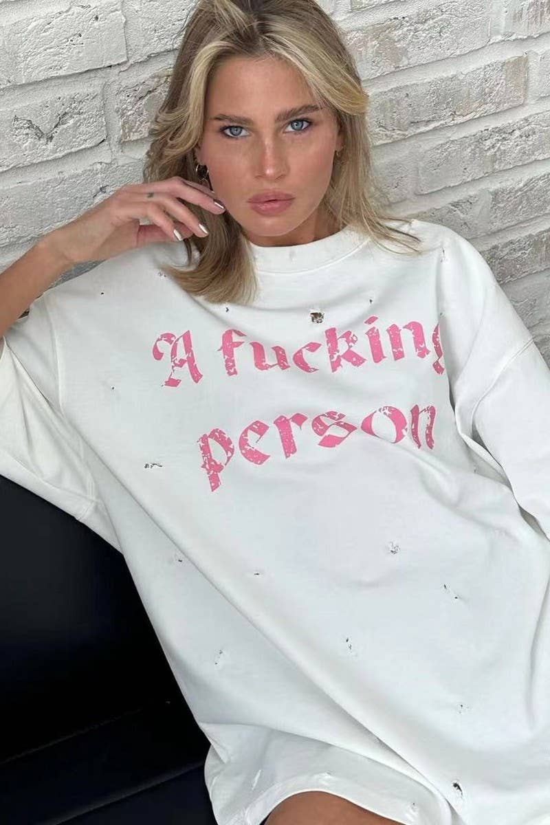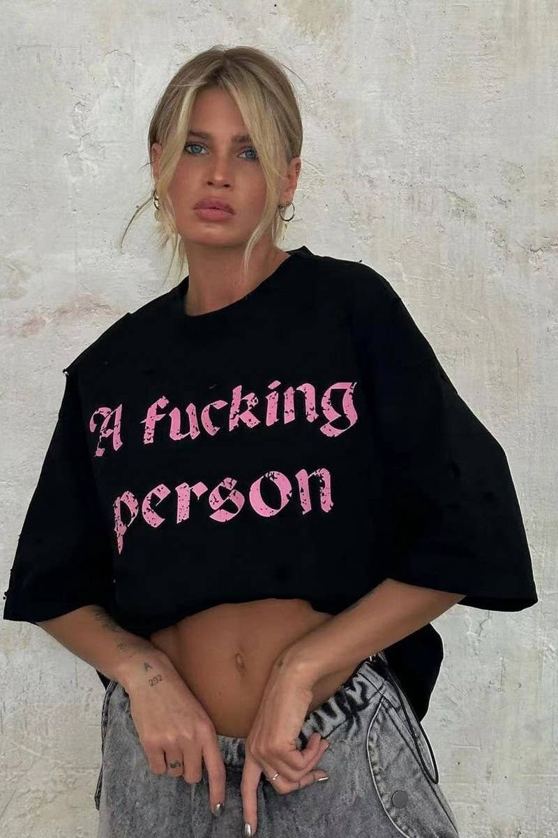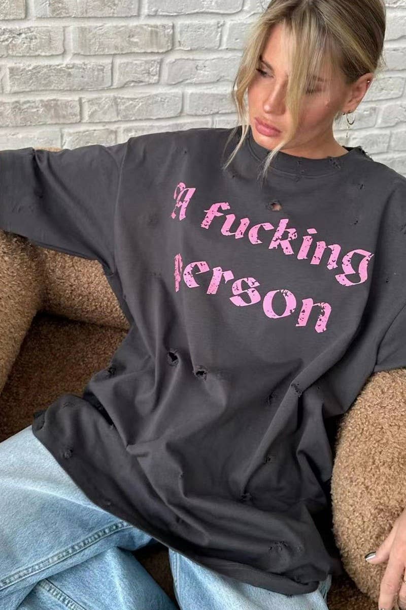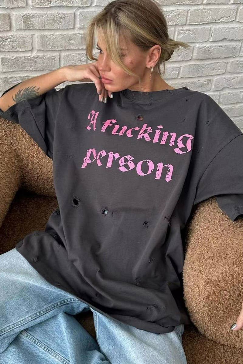 LETTER PRINT RIPPED STYLE MID-LENGTH SHORT SLEEVE