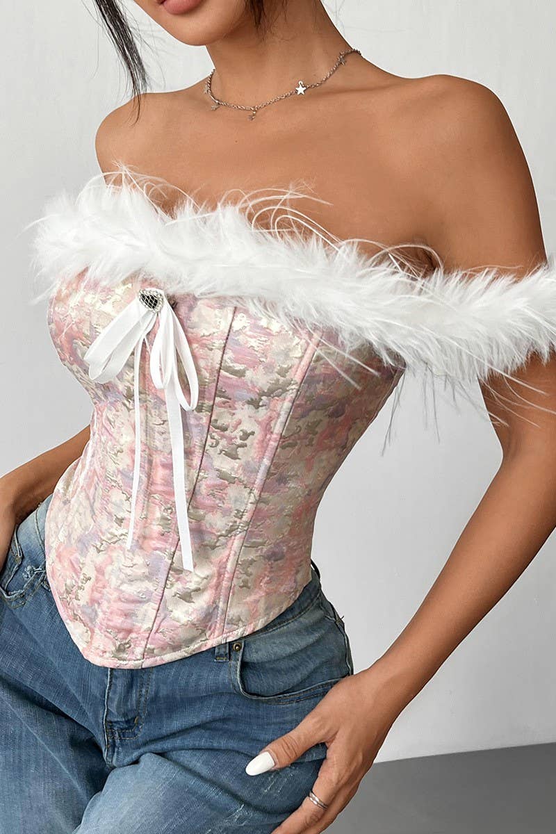 OFF-SHOULDER FUR PATCHWORK HERRINGBONE TOP