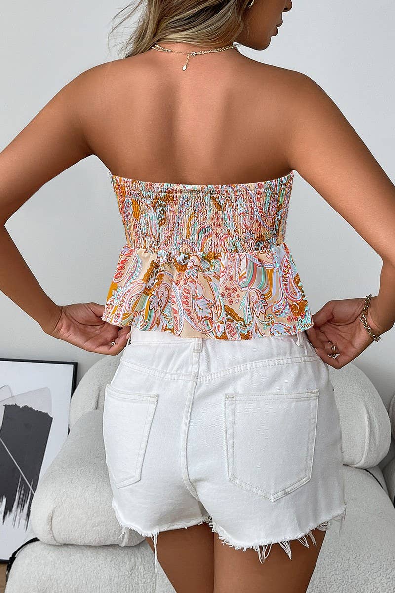 FLORAL RUCHED STRAPLESS OFF SHOULDER CROP TOP