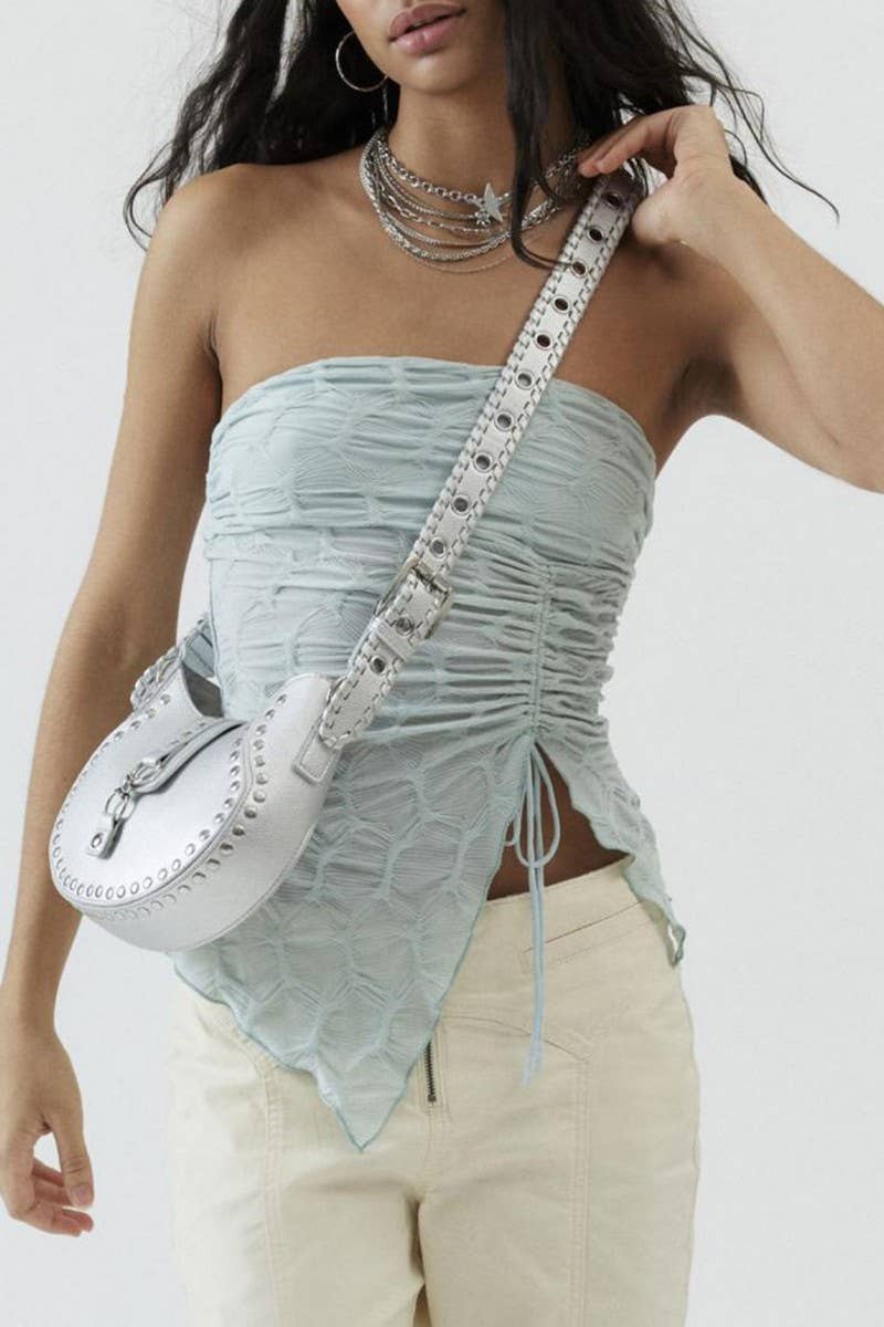 SOLID RUCHED STRAPLESS ASYMMETRICAL TIE CROP TOP