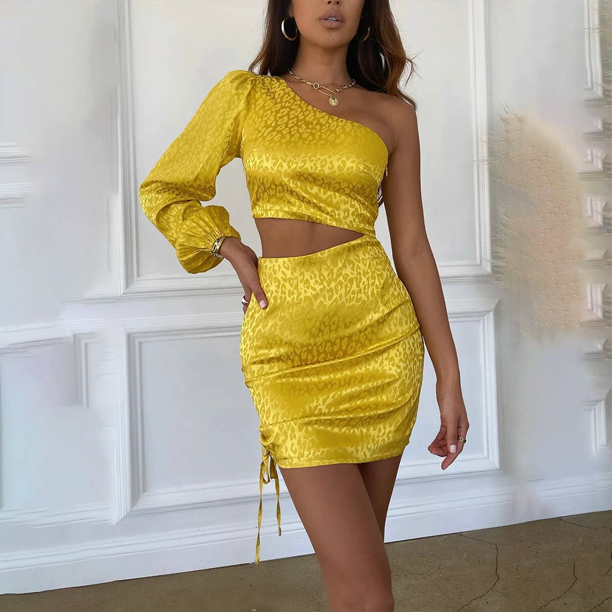 DARK PRINT ONE-SHOULDER DRAWSTRING SHORT DRESS