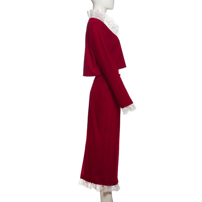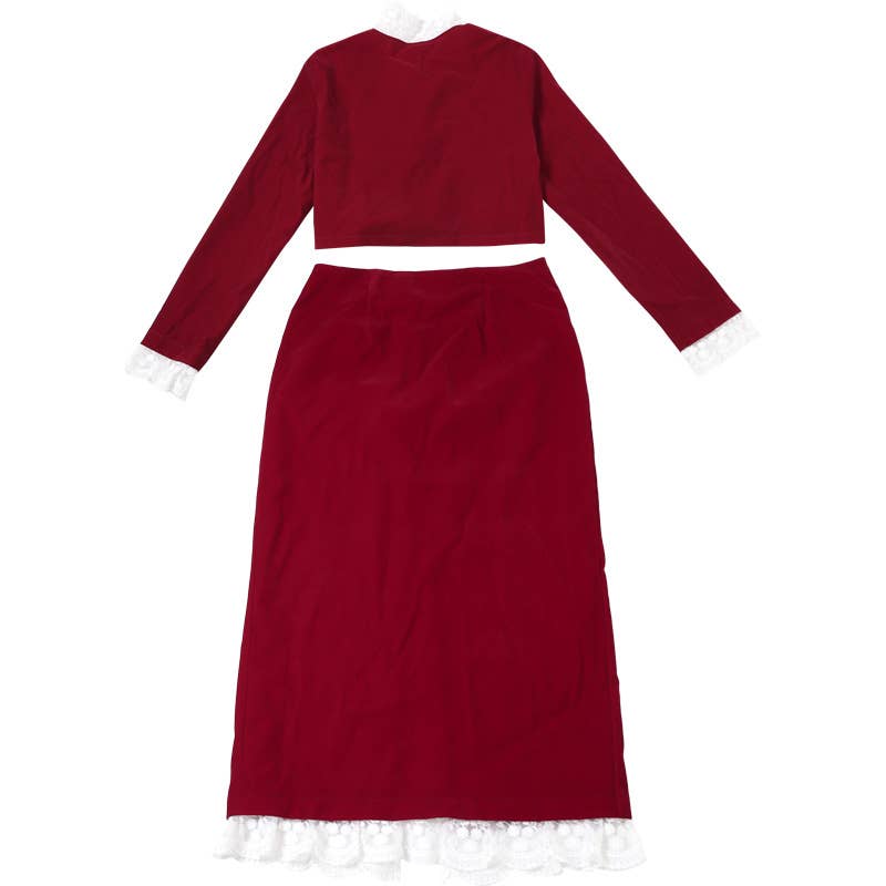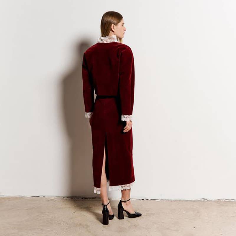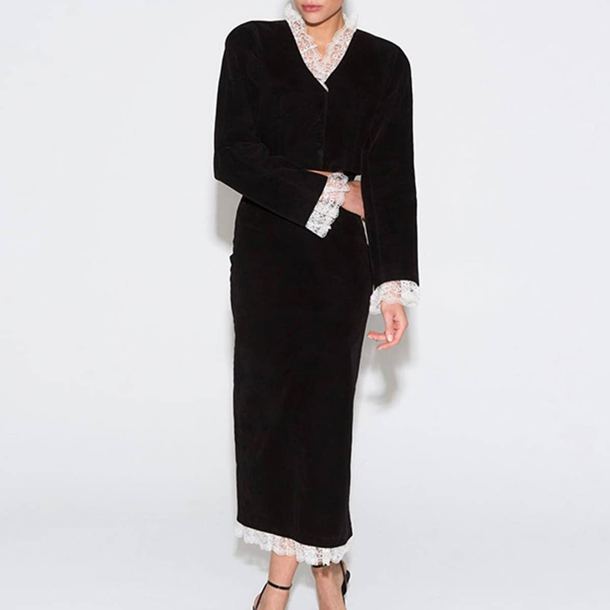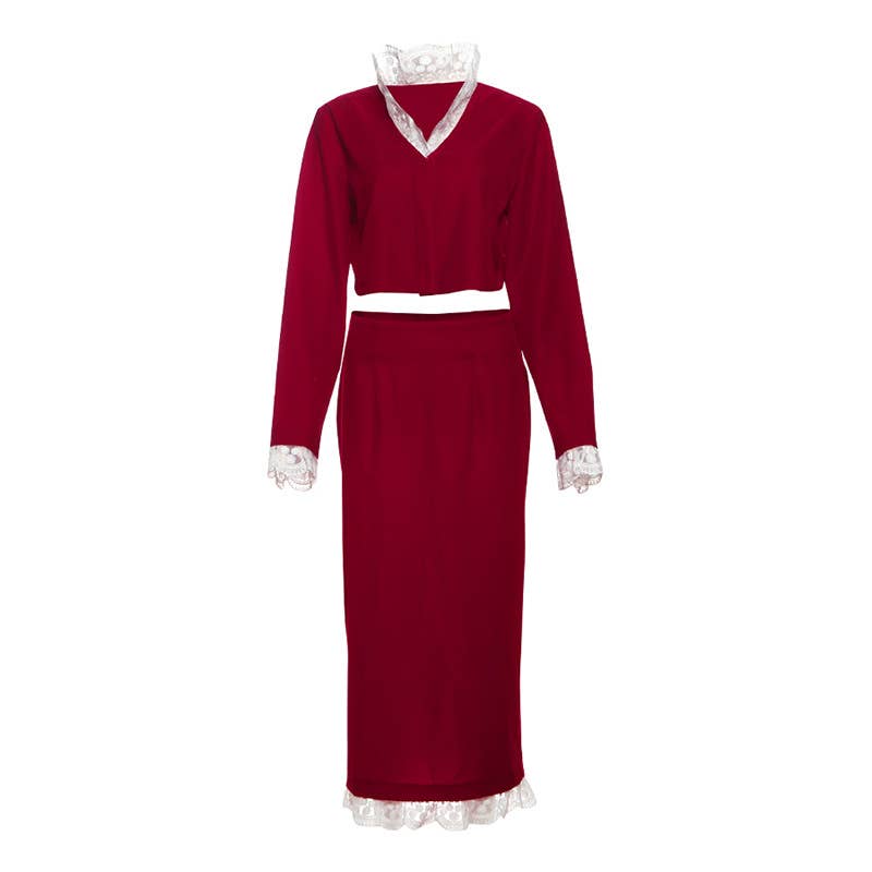 DEEP V LACE PATCHWORK CROP TOP SPLIT SKIRT SET
