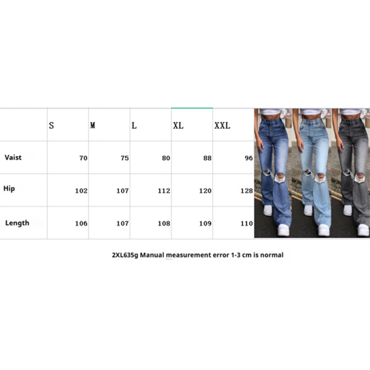 '- Material: 92% rayon + 8% other (non-elastic stiff fabric)\n- Process: distressed washing\n- Size: S, M, L, XL, XXL (see picture for details)\n\nProduct types on sale this issue:\nWomen's jeans, high-waist jeans, wide-leg jeans, straight jeans, skinny jeans, mom jeans, boyfriend jeans, flared jeans, boot-cut jeans, stretch jeans, ripped jeans, distressed jeans, cropped jeans, vintage washed jeans, black jeans, light-washed jeans, loose jeans, baggy jeans, low-waist jeans, tapered jeans, acid-washed jeans, slim jeans, women's jeans, oversized jeans, casual jeans, soft stretch jeans, classic blue jeans, street style jeans, Y2K jeans, vintage denim style.