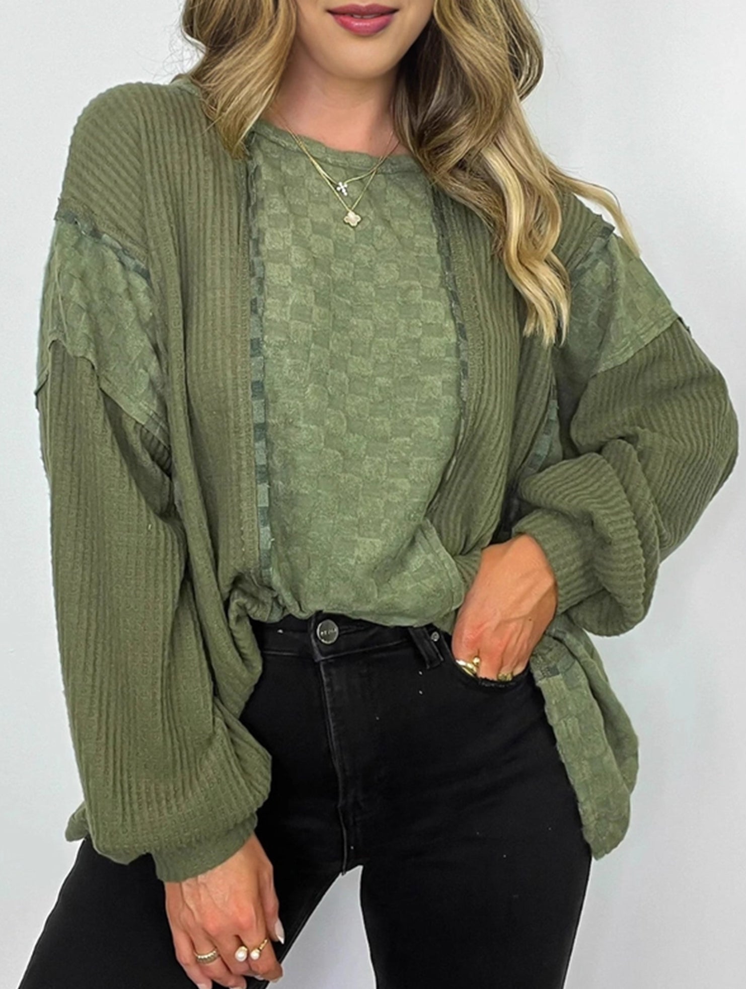 DROP SHOULDER CHECKERED WAFFLE PULLOVER_RCJW06705