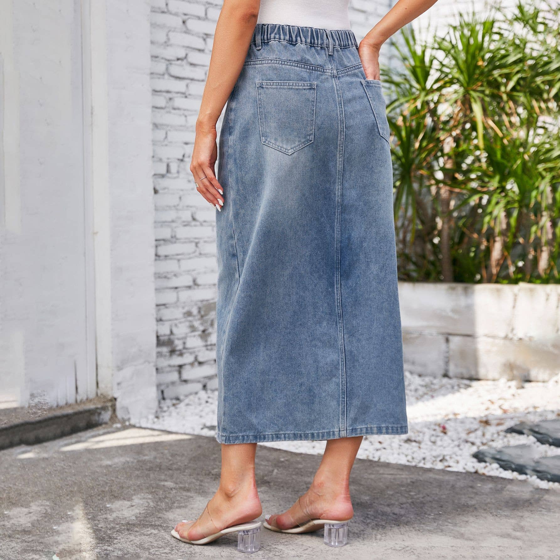 ELASTIC-WAISTED SLIT DENIM SKIRT