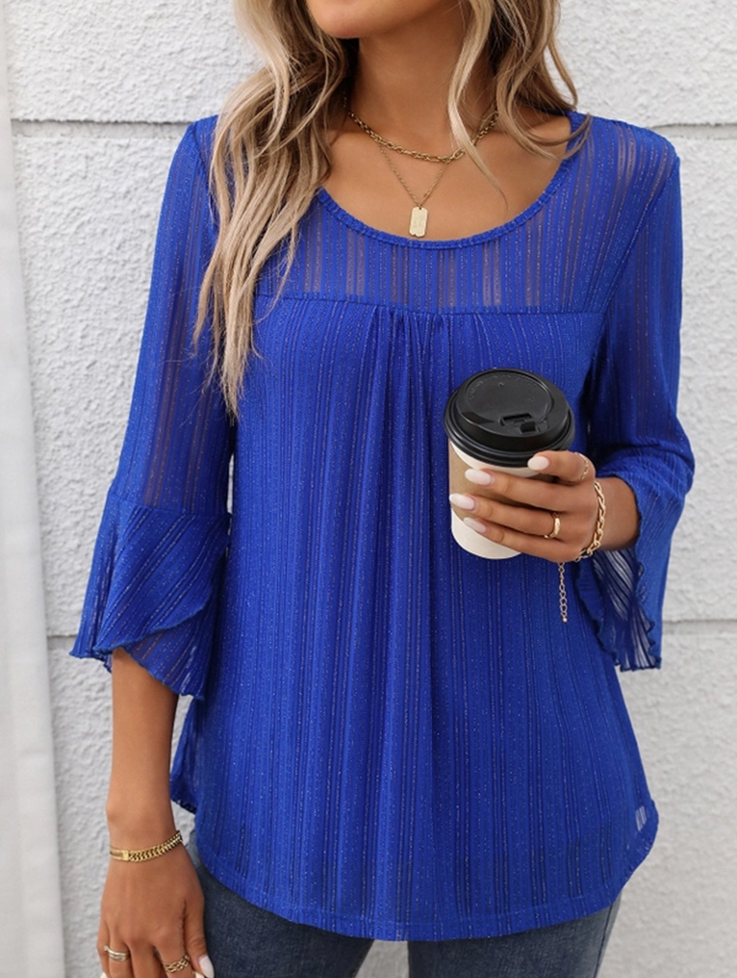 Elegant Round Neck Lotus Sleeve Glitter Gauze Top ??Sparkle with Grace and Comfort