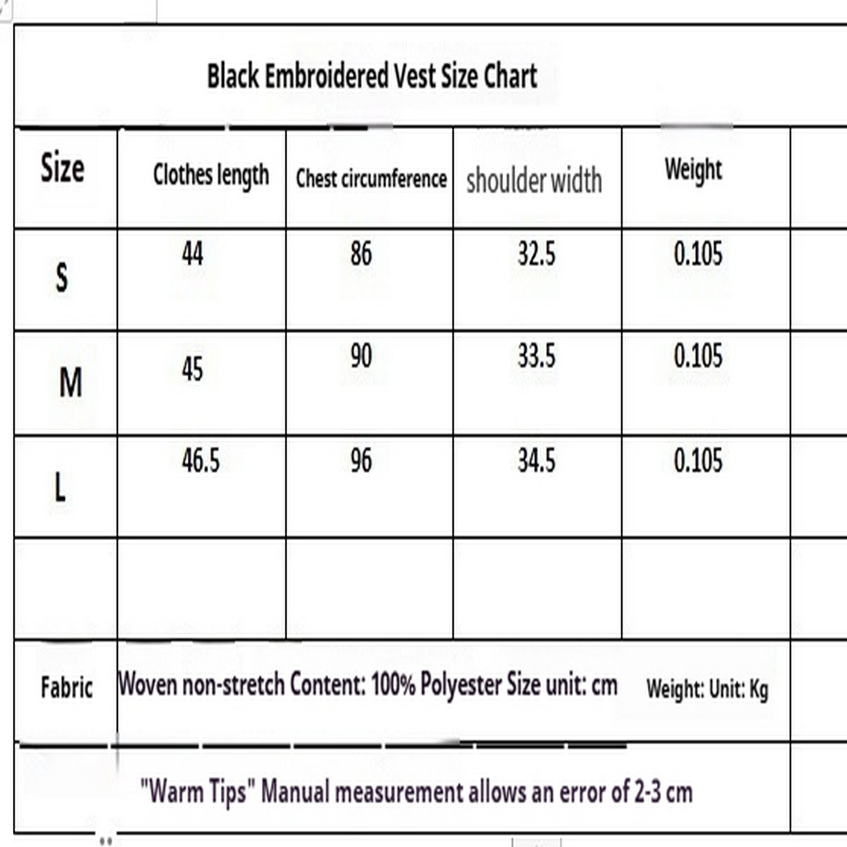 '- Material: Polyester (polyester fiber)\n- Size: S, M, L\n- Weight: 105g