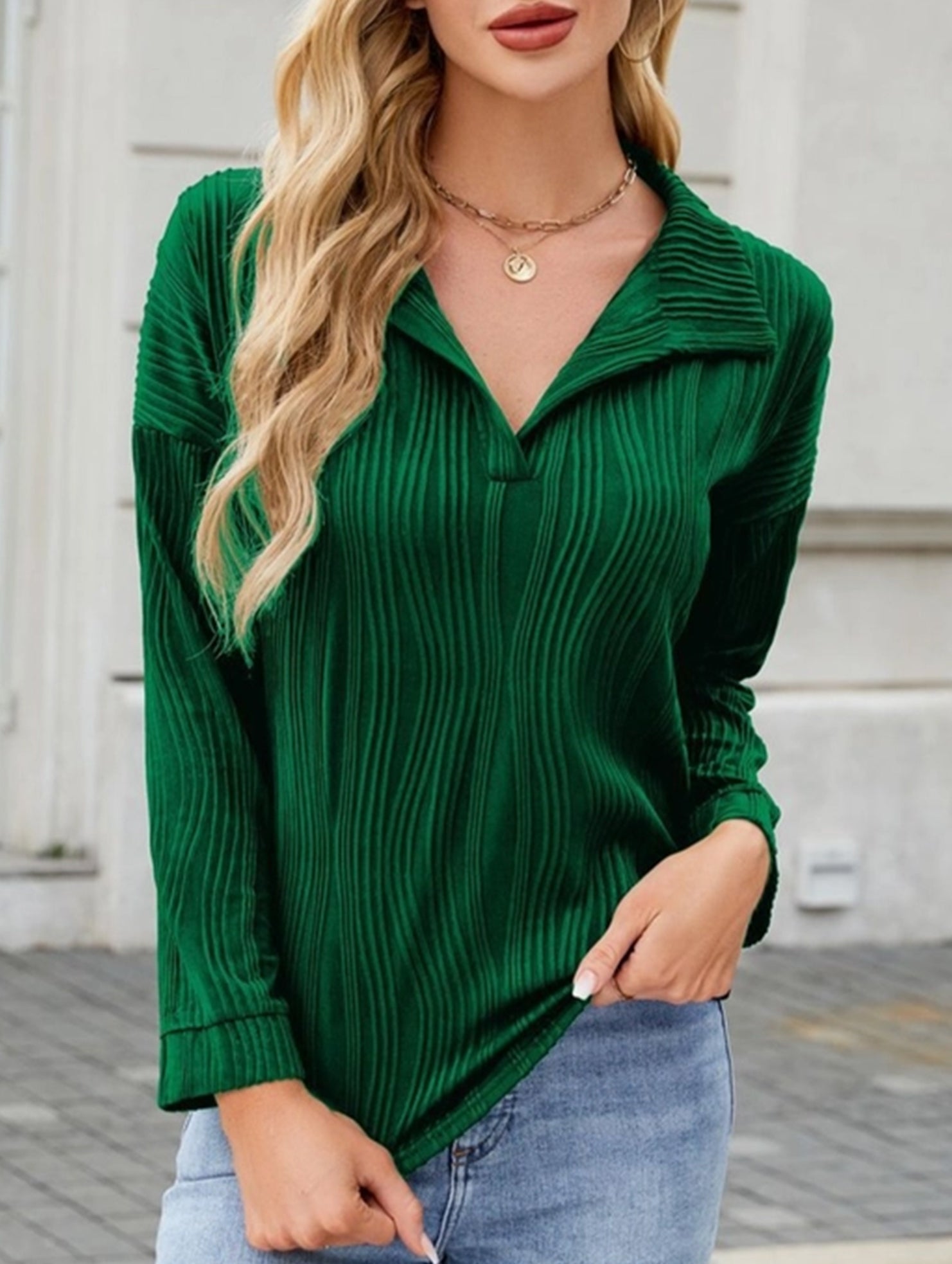 Fashion Lapel Solid Color Wave Texture Long-Sleeve T-Shirt