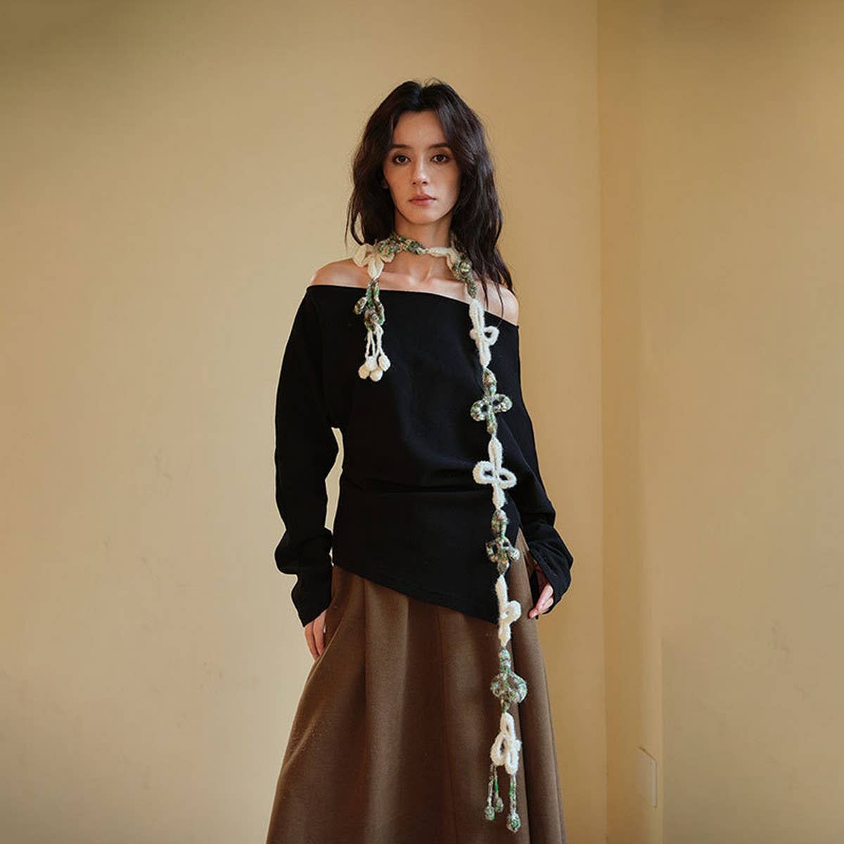 Floral Knit Skinny Scarf - Crochet Neck Wrap