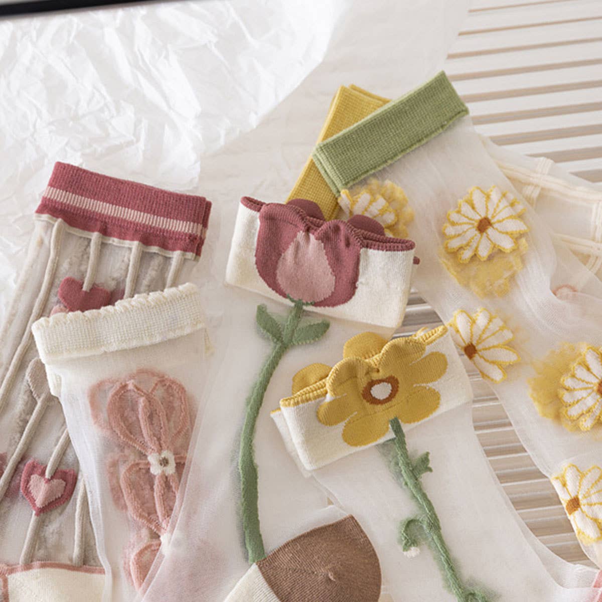 FLORAL SUMMER SHEER MESH SOCKS FOR WOMENS\nSIZE:OS(5)\n100% POLYESTER\nMADE IN CHINA\n\nFabric: Crystal silk\nConstruction: Seamless, boneless\nNot: Machine stitched\nFeatures: Quick-drying, sweat-wicking, friction-resistant\nDesign: Botanical floral\nPackaging: Pouch\nGender: Female\nAge Range: Youth (13-18 years old), Young Adults (18-40 years old), Middle-aged (40-60 years old)\nMain Fabric Composition: Nylon\nSock Height: Mid-calf\nNeedle Count: 200N\nSuitable Seasons: Summer, Spring\nProduct Category: Casual Everyday Socks\nColors: 3D Tulip, Full-body Flowers, Vertical Striped Hearts, Lotus Hearts, 3D Yellow Flowers, Checkered Blooms\nSize: One size\nImported: No\nComposition and Content: 50%\nMain Fabric Composition Content: 50% - 70%\nStyle: Casual\nWeaving Method: Single needle\n\nTypes of products that will be on the shelves during this period: \nsocks for women£¬socks for girls£¬socks with grips for women£¬socks for flats£¬socks for women no show£¬socks for women ankle high£¬socks for women crew length