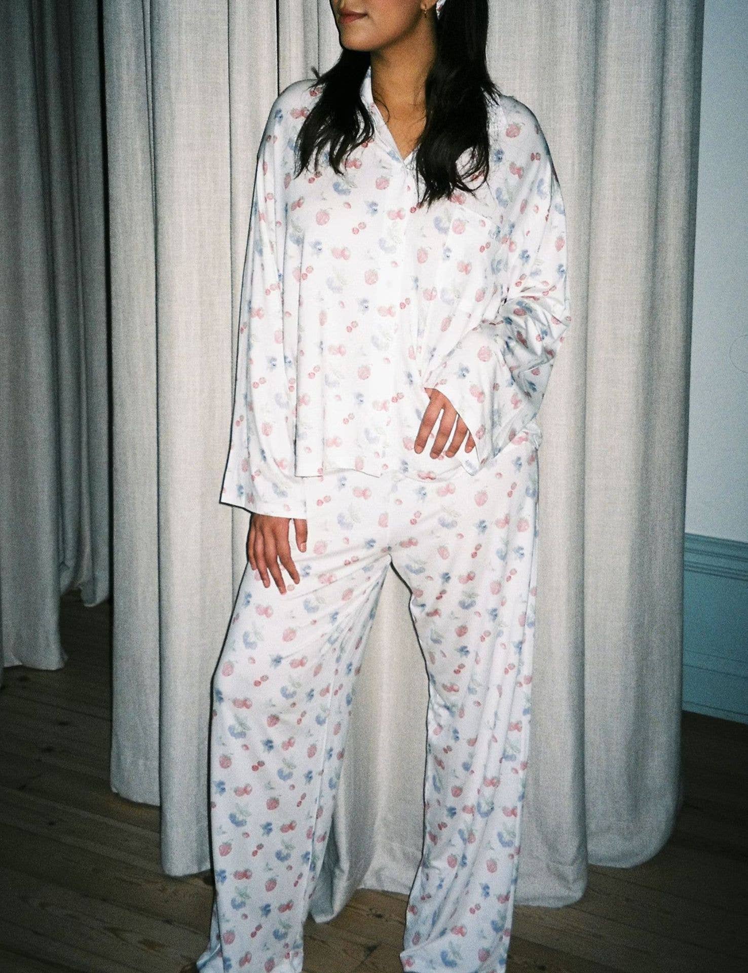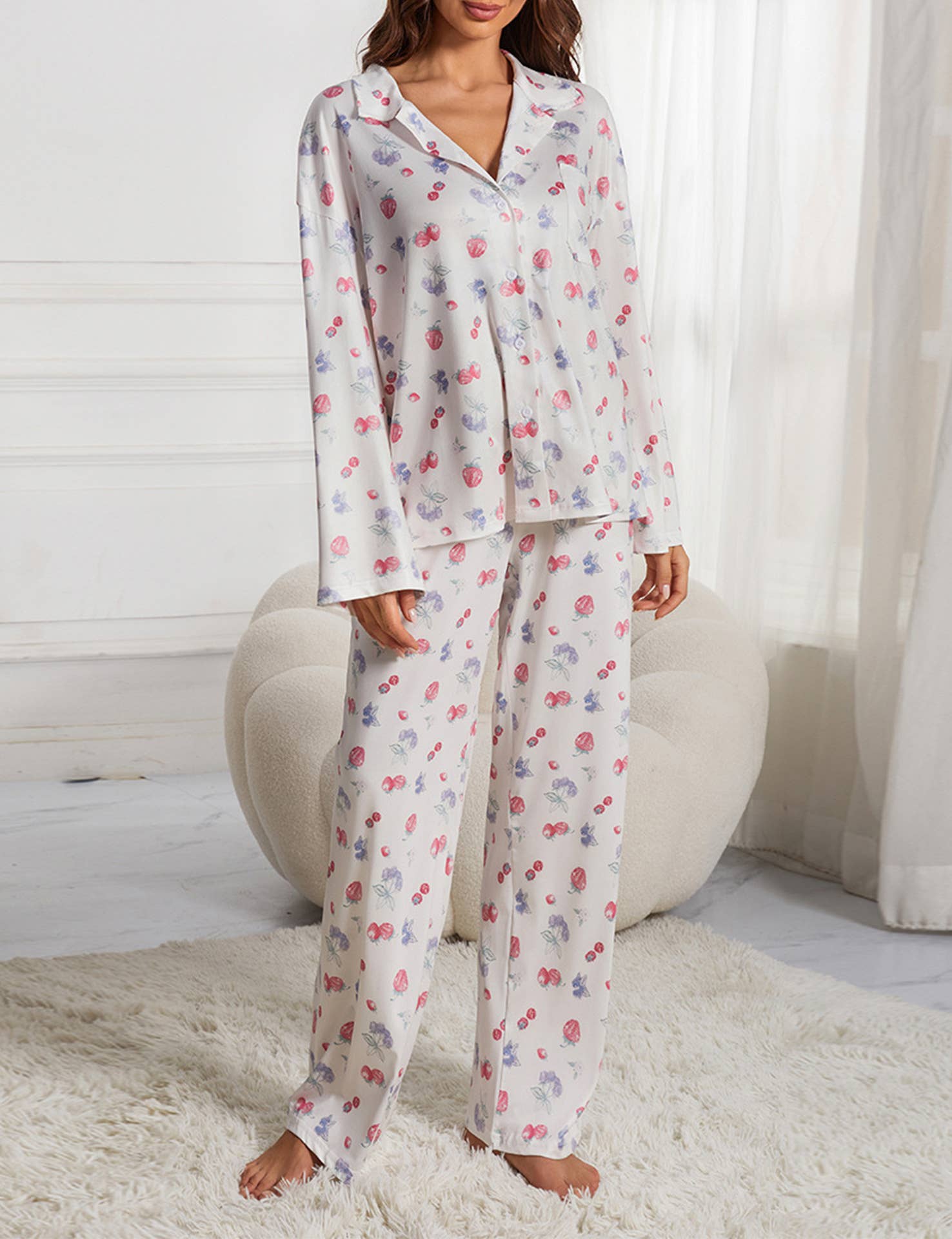 FLOWER AND FRUIT PRINT WIDE LEG PANT PAJAMA SET