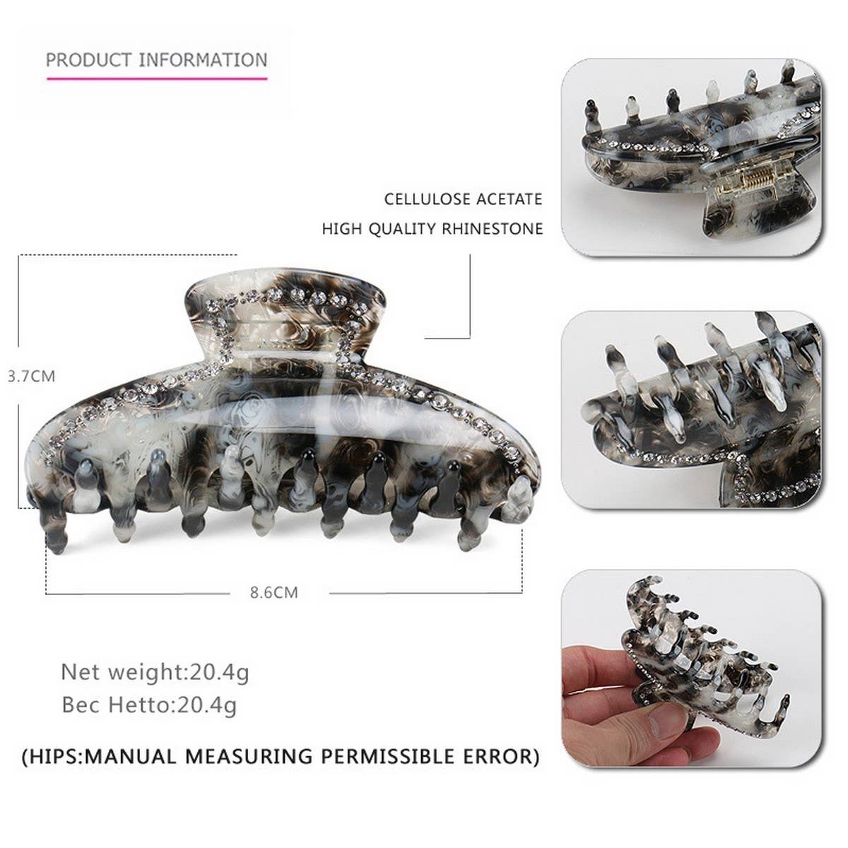 ? Size: 8.6 cm x 3.7 cm / 3.39 in x 1.46 in\n? Material: Acetate Sheet\n? Design Elements: French vintage style accented with sparkling Czech rhinestones ???????\n? Style: Elegant and retro, perfect for refined styling or adding a touch of Parisian charm to any outfit\n\n#acetatehairclip #frenchvintageclip #czechrhinestone #retroaccessory #eleganthairclip #8_6cmclip\nTypes of products that will be on the shelves during this period:\nHair claw clip set, large hair claw clip, flower hair claw, boho claw clip, pearl hair claw, modern hair claw, rhinestone claw clip, colorful hair claw, hair clips claw, hair clips for women, wholesale hair clips, bulk hair clips, hair clip display, clips for hats, clips for kids, mini hair clips, trendy hair clips, fashion hair claws, strong hold hair clip, acrylic claw clip.