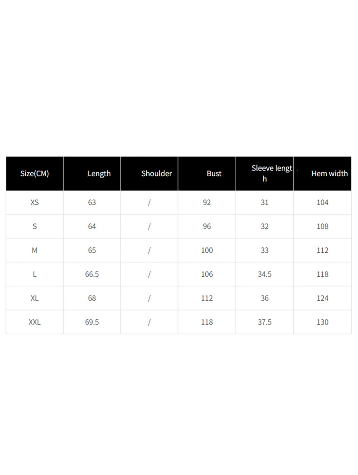 Sizes: XS, S, M, L, XL, XXL