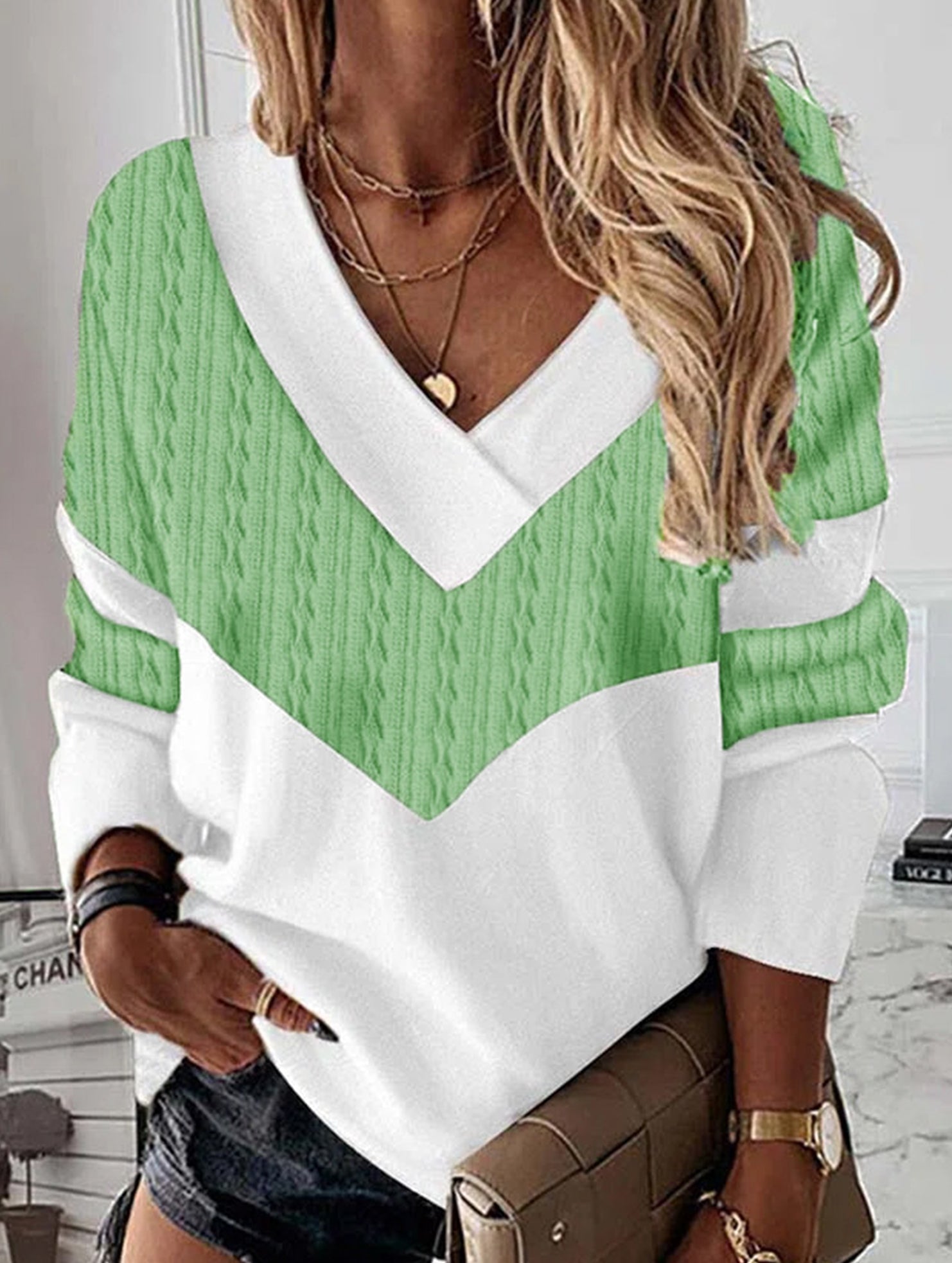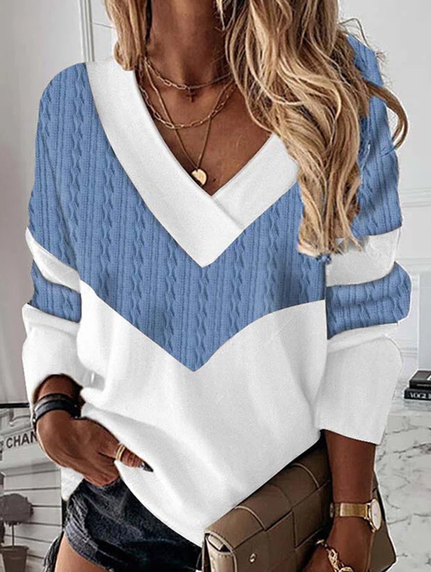 Pullover contrast print V-neck long-sleeved shirt