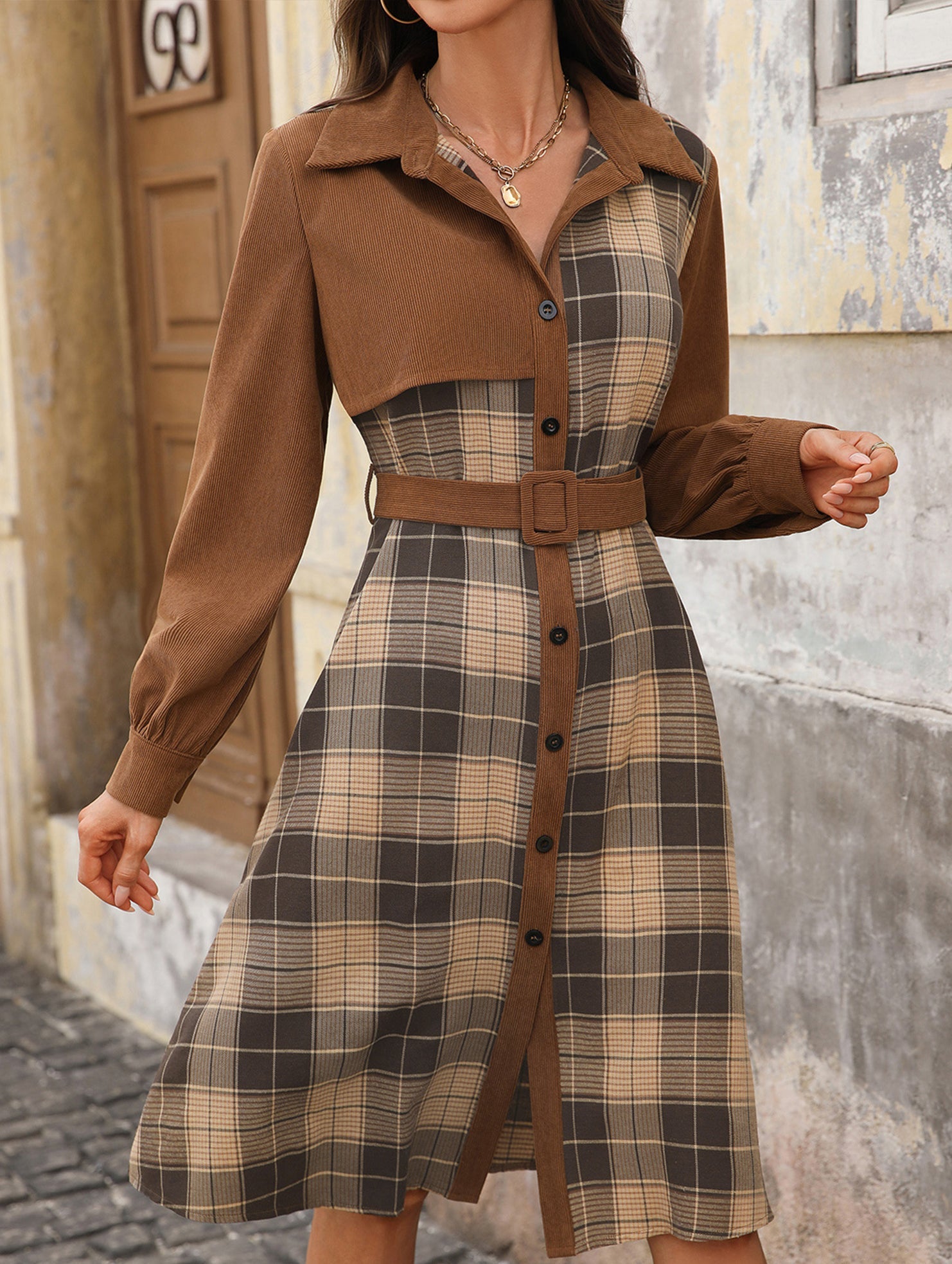 Retro-style shirt collar plaid patchwork dress
