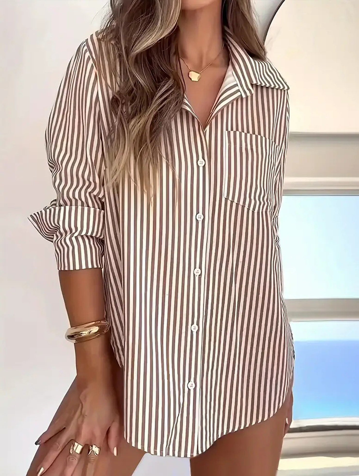 Striped lapel long-sleeved cardigan shirt