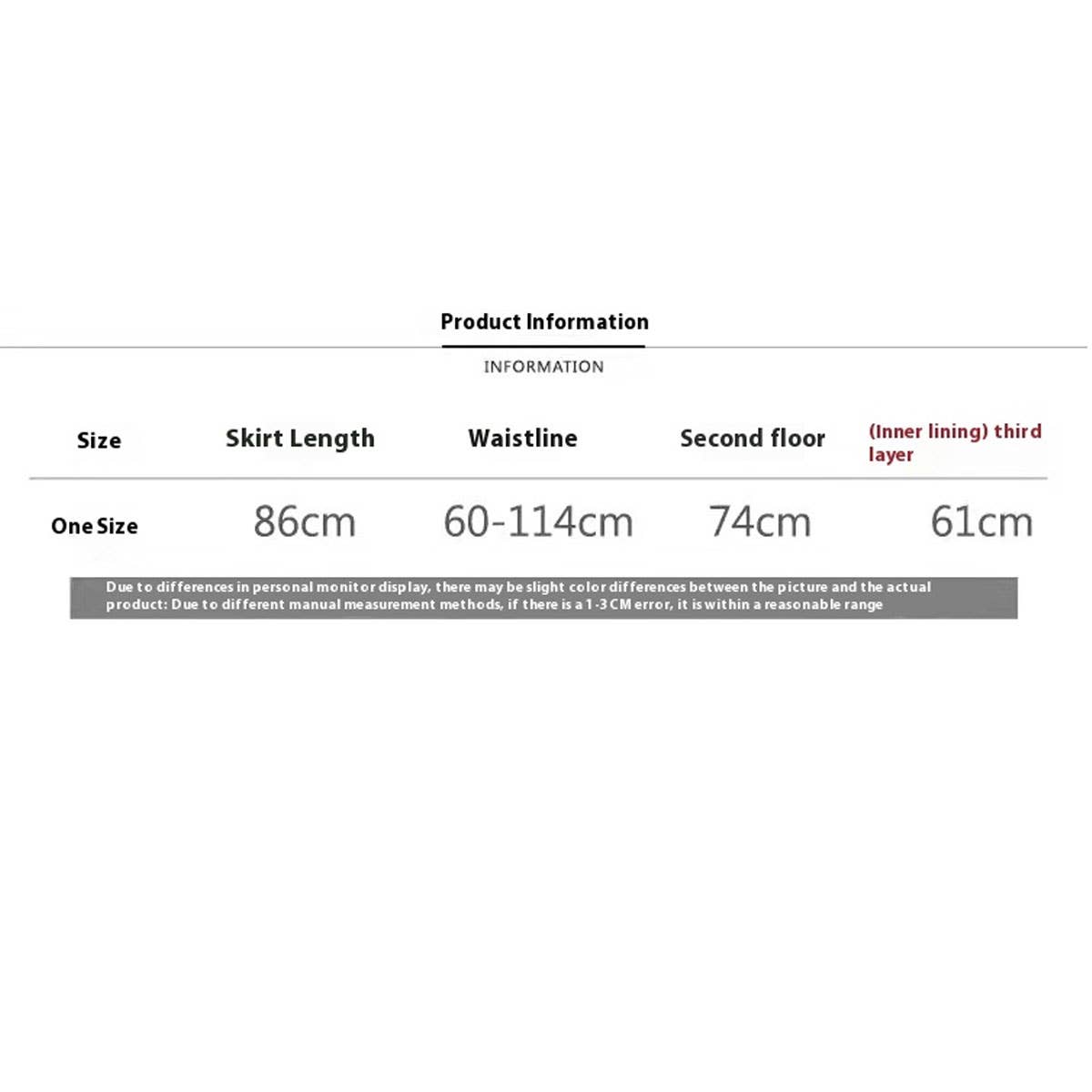 Product attributes\nPattern Solid color\nCraft Collage/stitching\nFabric name Mesh\nMain fabric component Polyester (polyester fiber)\nMain fabric component 2 Polyester (polyester fiber)\nSkirt type A-line skirt\nSkirt length Midi skirt\nPopular elements Ruffles\nStyle type Fresh and sweet\nMain fabric component content 95% and above\nMain fabric component 2 content 95% and above\nElasticity High elasticity\nSize One size Skirt length 33.86 inches (86 cm), waist circumference 23.62-44.88 inches (60-114 cm), second layer lining 29.13 inches (74 cm), third layer lining 24.02 inches (61 cm)\n\nMesh Skirt,Leopard Mesh Skirt,Floral Mesh Skirt,Black Mesh Skirt,solid Color Mesh Skirt,Elastic Waist Skirts,Tiered Elastic Waist Skirt,Comfortable Elastic Waist Skirt,Skirts,Skirts Women,Skirt Set,Skirt Sets For Women,,Women Clothing,Tulle mesh skirt,,Skirt.Mesh,Tulle skirt,Tulle skirts women,Tulle skirt set,Tulle skirt girls,Tulle skirt women,Tulle skirt dress,Tulle skirt black,Tulle skirts with pockets,Tulle