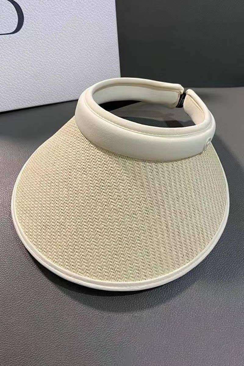 TWO TONE STRAW VISOR HAT\nSIZE:OS(1)\n100% STRAW\nMADE IN CHINA\nWOMEN SUMMER HAT, WOMEN BEACH HAT\nWOMEN SUNSCREEN CAP,WOMEN STRAW HAT\nWOMEN SUN HAT