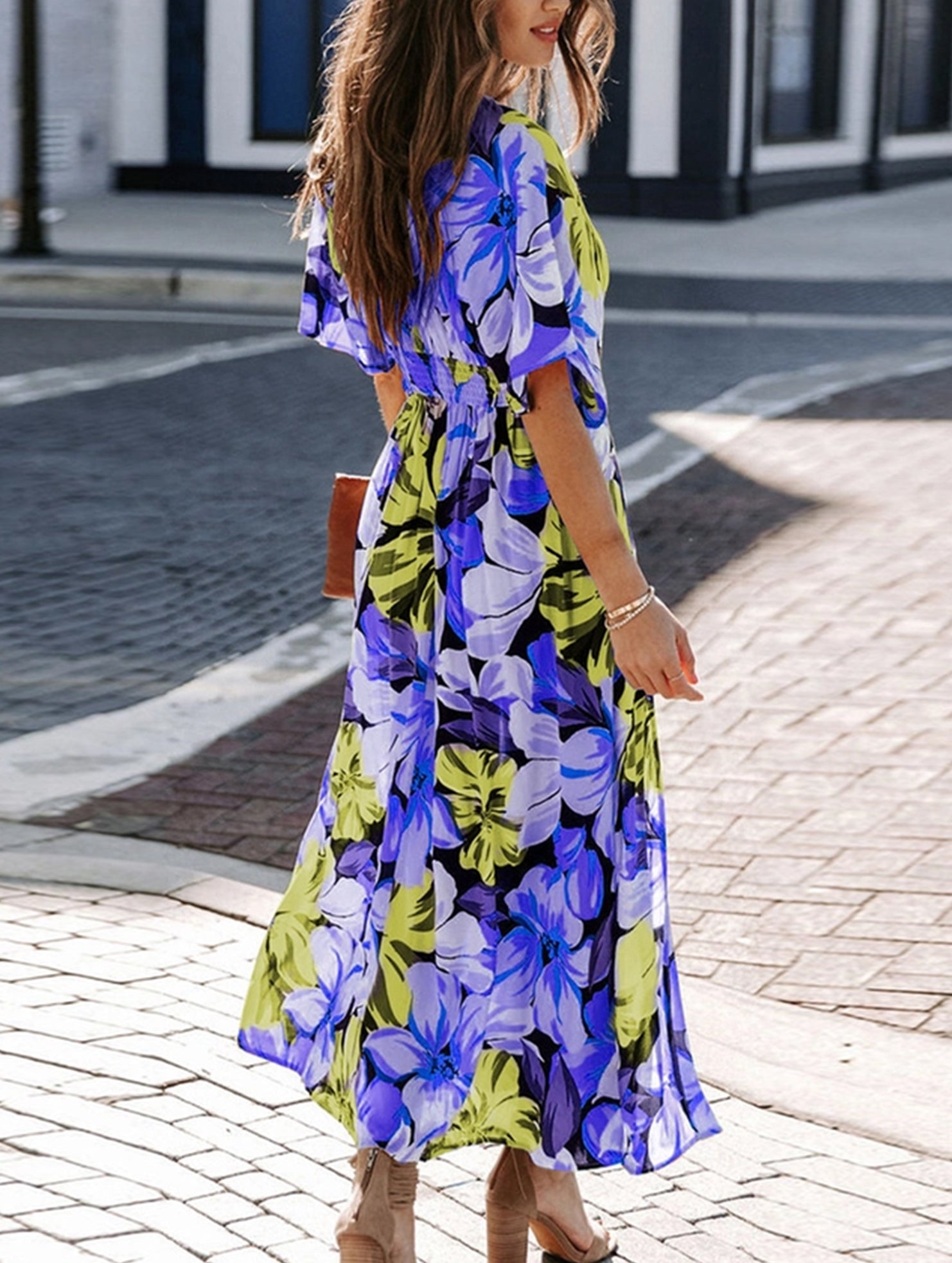 V Neck High Slit Dress with Fashion Print and High Waist Fit
