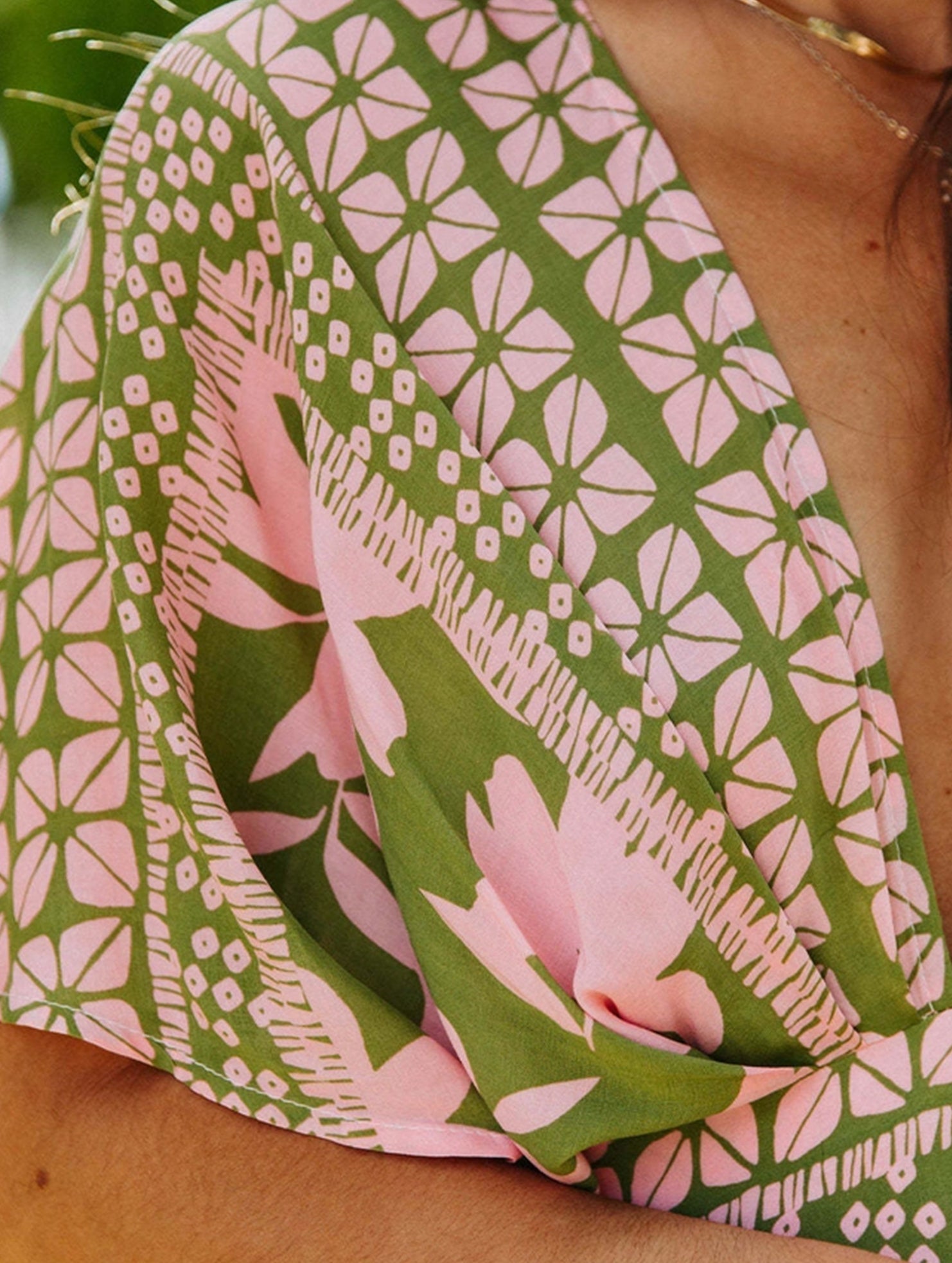This V-neck high Slit Dress is light, soft, and easy to wear. It has a high waist, a pretty print, and a stylish slit that lets you move freely. The A-line shape gives a nice fit and flowy feel.