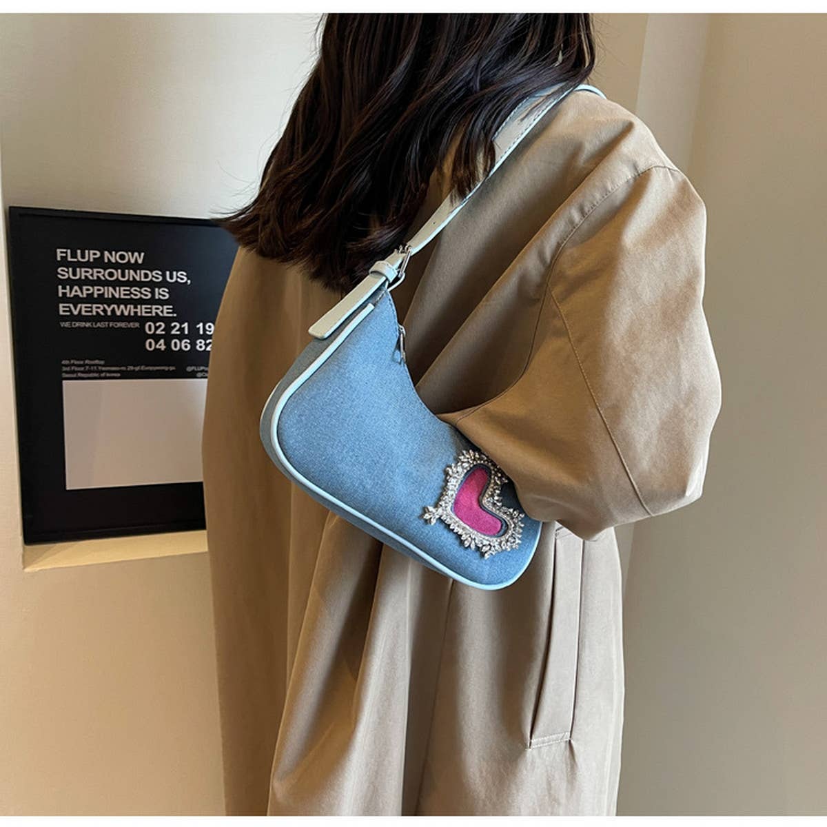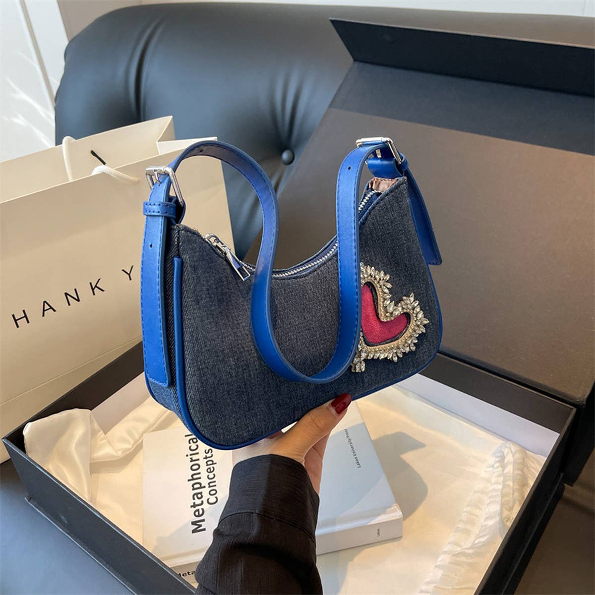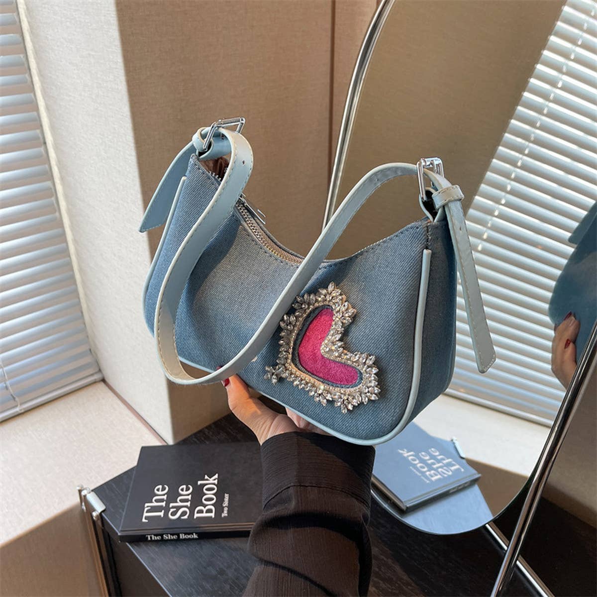 WOMEN HEART RHINESTONE ARMPIT BAG\nSIZE:OS(1)\n100% DENIM\nMADE IN CHINA\n\nLEATHER PURSES FOR WOMEN,PURSES AND HANDBAGS ON CLEARANCE,TOTE PURSE,WOMEN TOTE PURSE,UNIQUE PURSES,WOMENS TOTE BAGS,SHOULDER BAGS,SHOULDER BAG WITH CHAIN,SHOULDER BAG WITH POCKETS,SHOULDER BAG WITH BARE SHOULDER BLACK,SHOULDER BAG WITH WHEELS,SHOULDER BAG WITH SEQUINS,SHOULDER BAG BUCKET,SHOULDER BAGS IN YELLOW,HANDBAGS,BAGS FOR RETAIL,BAGS FOR WOMEN,BAGS PURSES,BAGS TO SLAY,BAGS KRAFT,BAGS TOTES,NEW PRODUCTS, WINTER, AUTUMN, SPRING,WHOLESALE WITHOUT LABELS, OUTDOOR SPORTS,NOVELTY,BULK, CLEARANCE, 2023 NEW STYLE, BRAND NEW, BEST PRICE, FASHION, FLASH SALE, HIGH QUALITY, LOW PRICE, NEW TREND, SPECIAL OFFER, DIRECT SELLING, GOOD SELLING,CUTE,BOHO STYLE,LARGE CAPACITY, CANVAS, CLUTCH, CROSS-BODY, LARGE, MEDIUM, SMALL,TOP STORE,PORTABLE