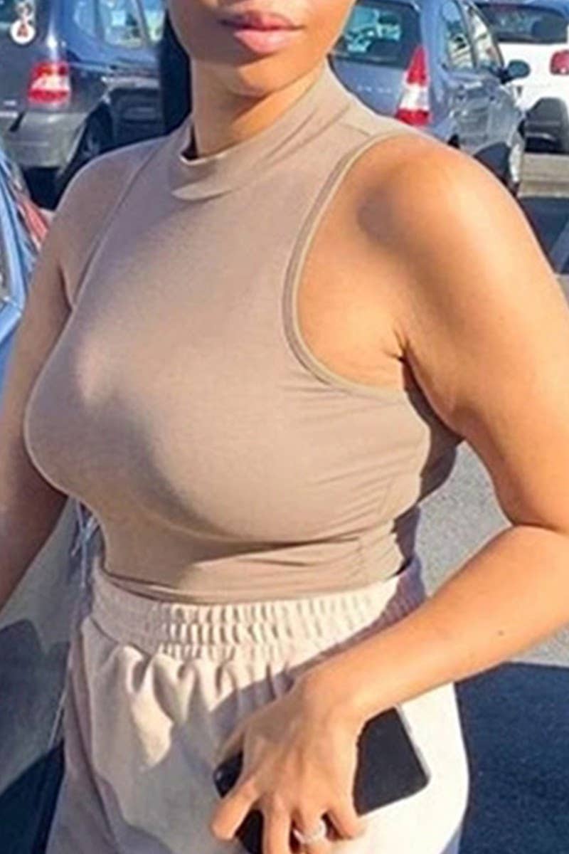 Design: Sleeveless cropped length, round neckline, body-hugging silhouette